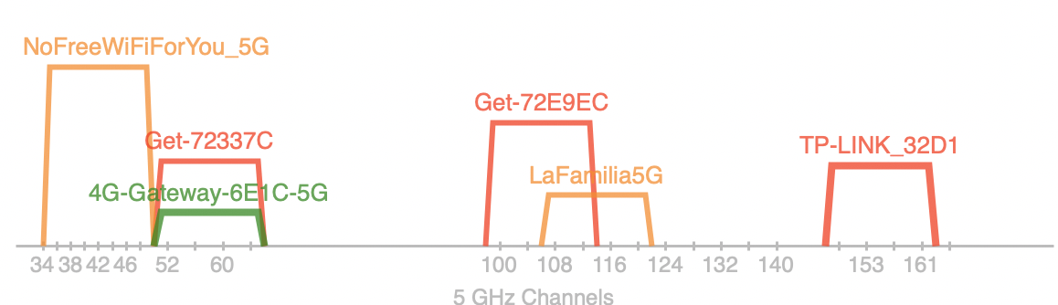 Unfortunately I can't choose channels above 48 on 5Ghz and 13 on 2.4Ghz. So 2.4Ghz is probably a bust, given the amount of disturbance.