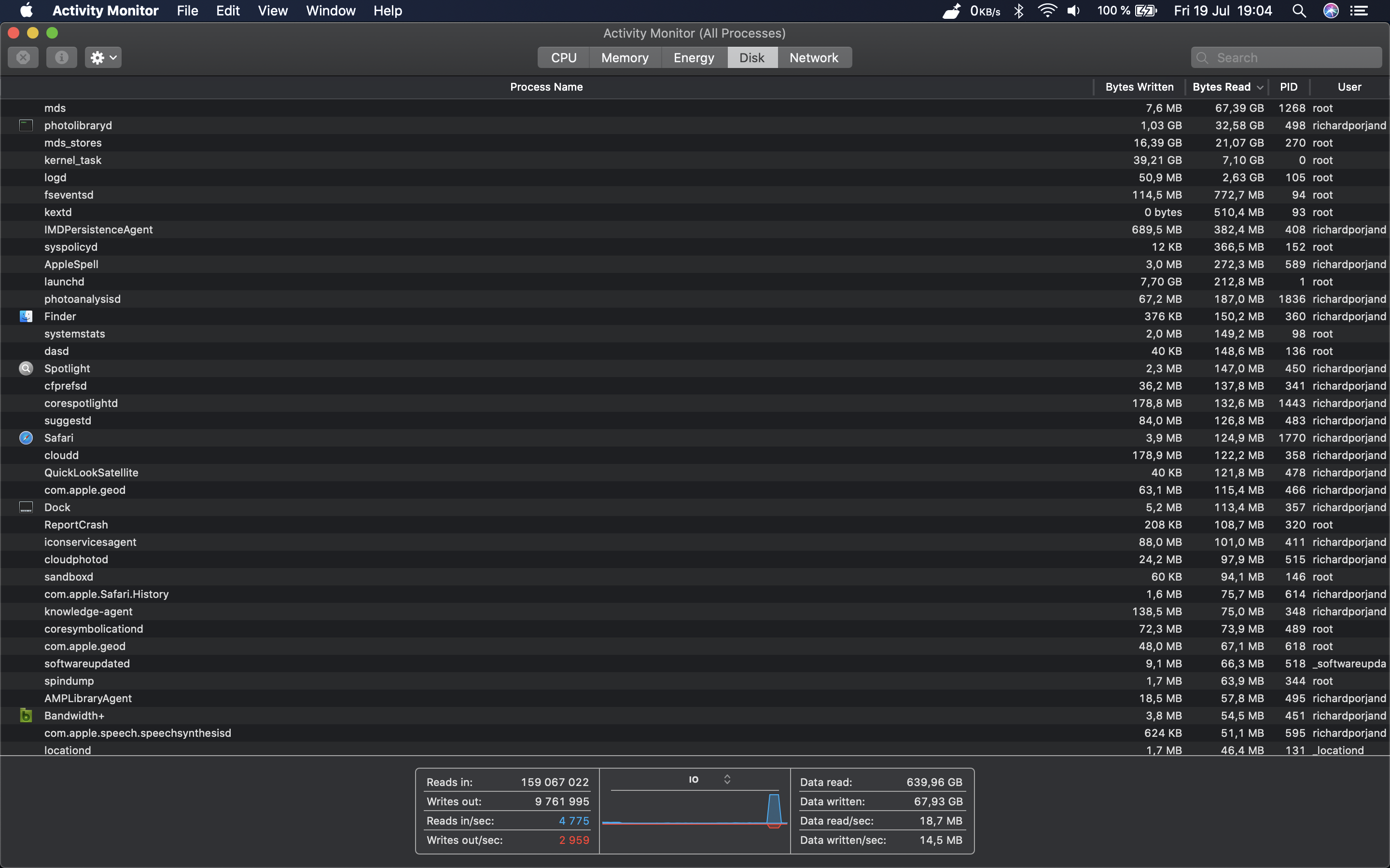 "mds_stores" or "mds" just READS through my entire disk (BYTES READ column), I can see it in Activity Monitor, whenever it gets to around 120 gigs, which is all my data, it starts again 😀