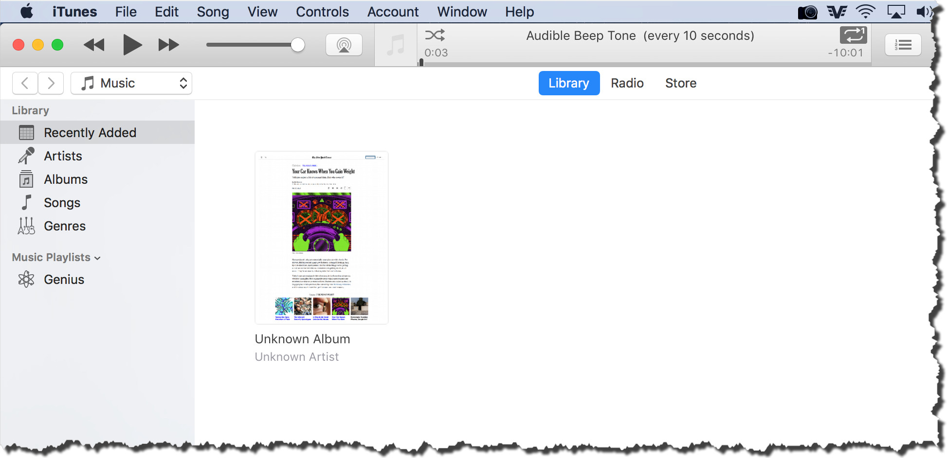 My guess is that OP has multiple uncategorized audio tracks (songs, podcasts, audio files, whatever) in his iTunes Library. Since the beep audio track is not categorized, it falls into this "Unknown album/unknown artist" bucket.