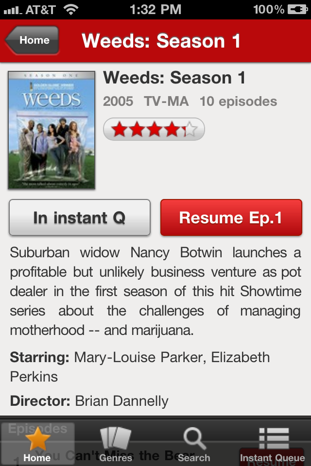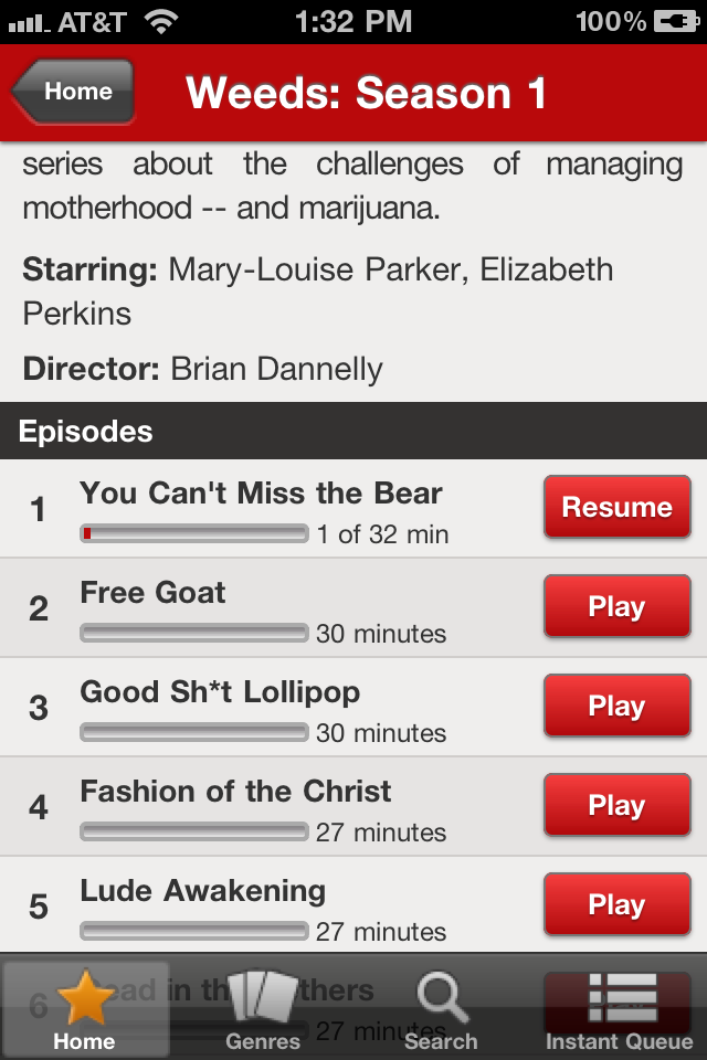 Does anyone know how to watch more than just the first episode of a TV season through the netflix app? The web and Xbox interfaces allow you to choose which episode you watch, I see no such functionality on the Ipad/iphone apps.
