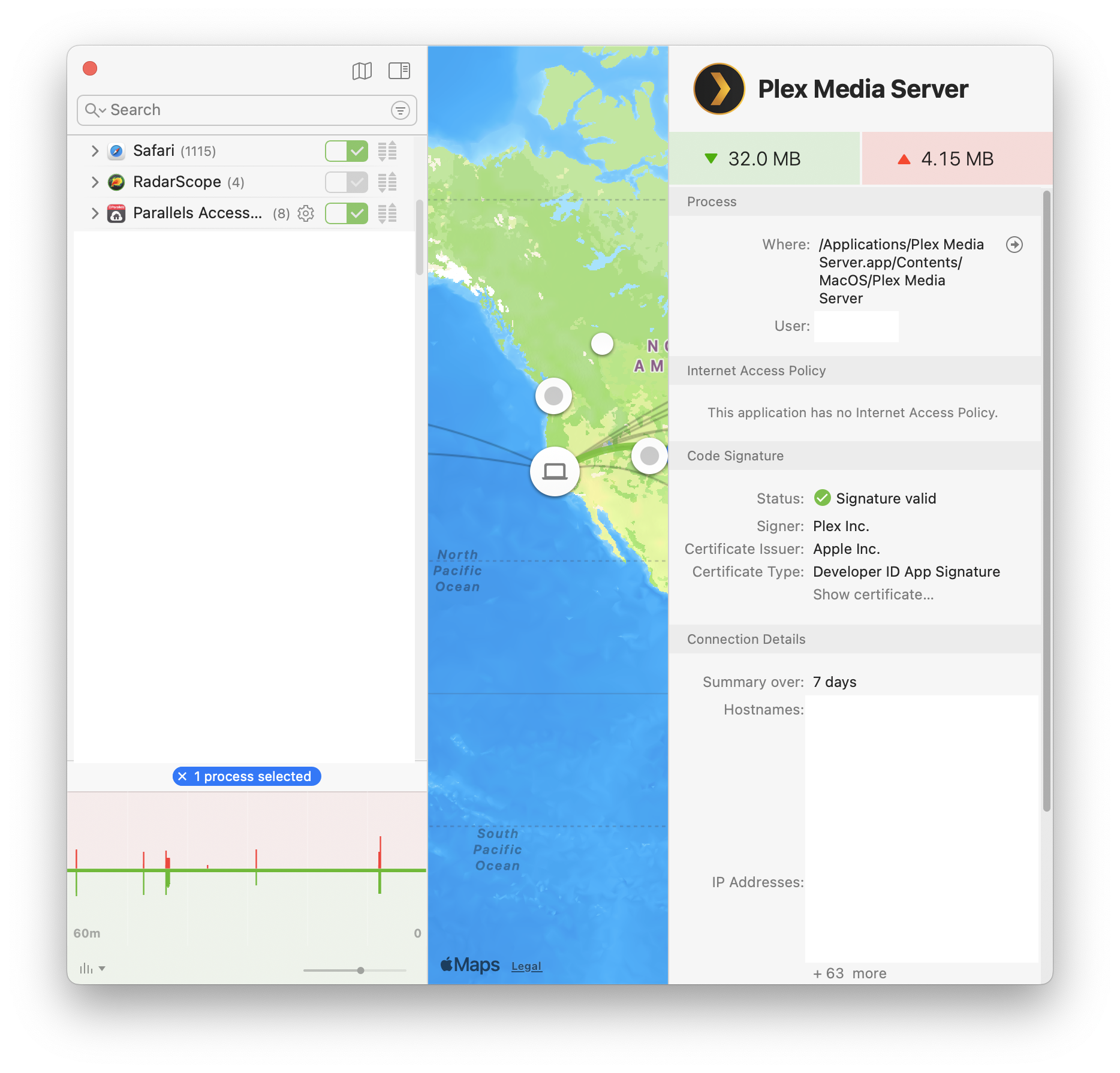 Is there any network monitoring app similar to https://www.softperfect.com/products/networx/? I use MenuMeters for current traffic monitoring and it works great but I'm looking for the statistics part (per time period and per app. Unfortunatelly ActivityMonitor is too basick.