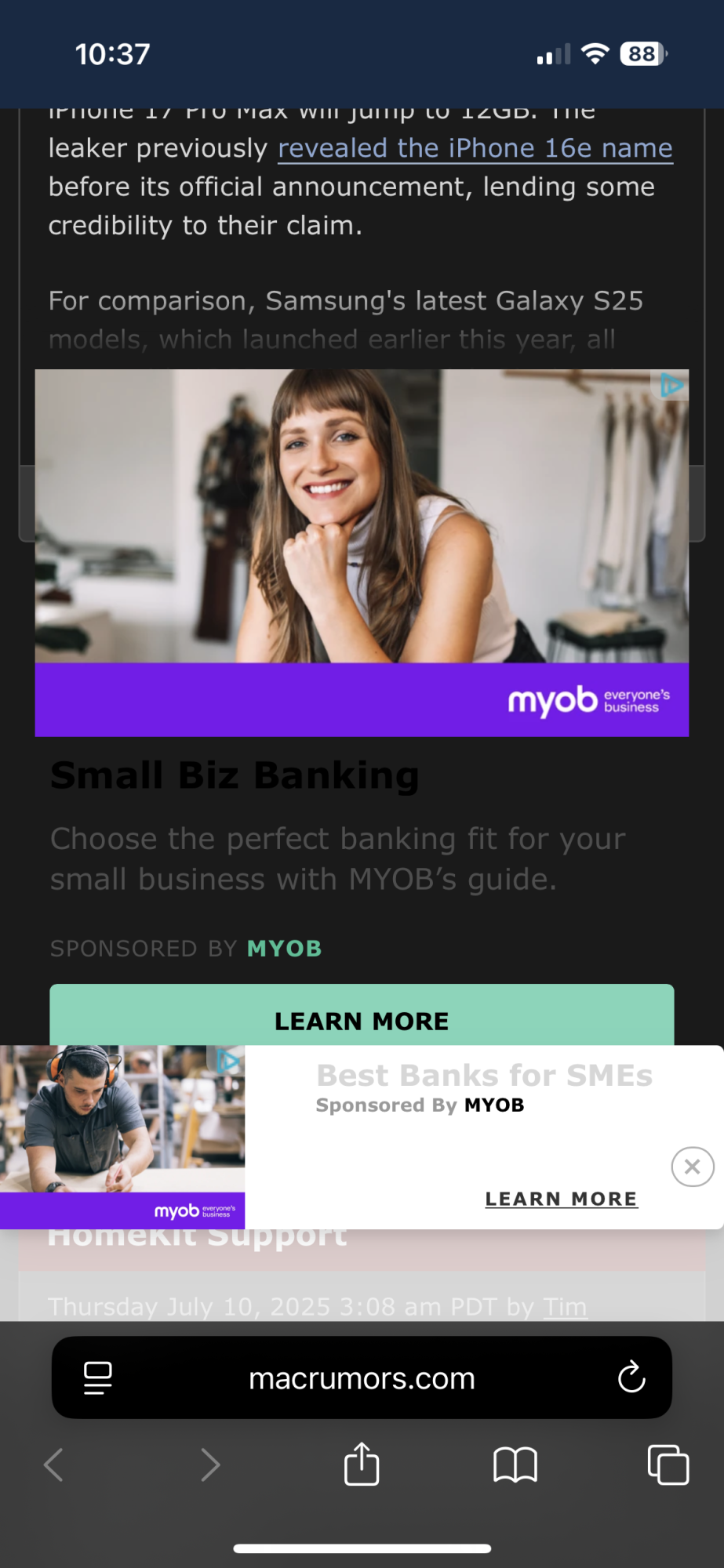 The ads fully overlay with article making it impossible to actually press the read more button without opening a new window with said ad. This is on an iPhone 14 Pro running latest iOS. Seems to occur when not logged in and in particular myob ads