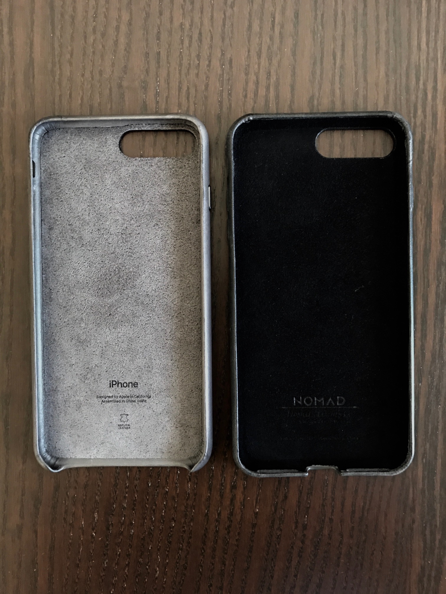 The feel of the leather is also very different. The Apple leather feels smooth where as the Nomad feels rugged. Some might say rough. This does not mean one leather is better than the other. They both feel like high quality leather. The Apple does feel slightly more slippery in my hands.