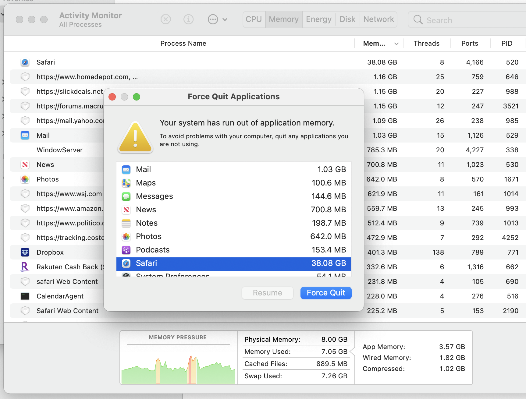 Just about daily, my new M1 MacBook Air starts to run warm (thought they were SO much cooler now) and then I get a popup to ForceQuit my applications with the message, "your system has run out of application memory (see screenshot below)" and showing me that Safari is using the most memory by far. In fact, I checked the RAM usage and its showing 6.3gb out of 8gb. Im wondering is this simply a RAM issue and I should return/exchange for the 16gb model?