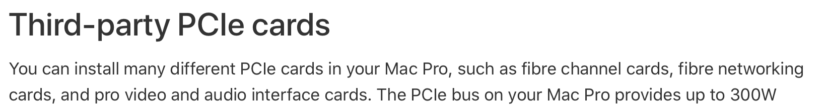The PCI-e cards that are not going off-the-charts with power consumption don't really have a major disconnect with Apple. The bigger issue is that Apple has a bigger issue with implementations that have insatiable power consumption increase objectives. The new PCI-e v5 aux power standards are shooting up to 600W