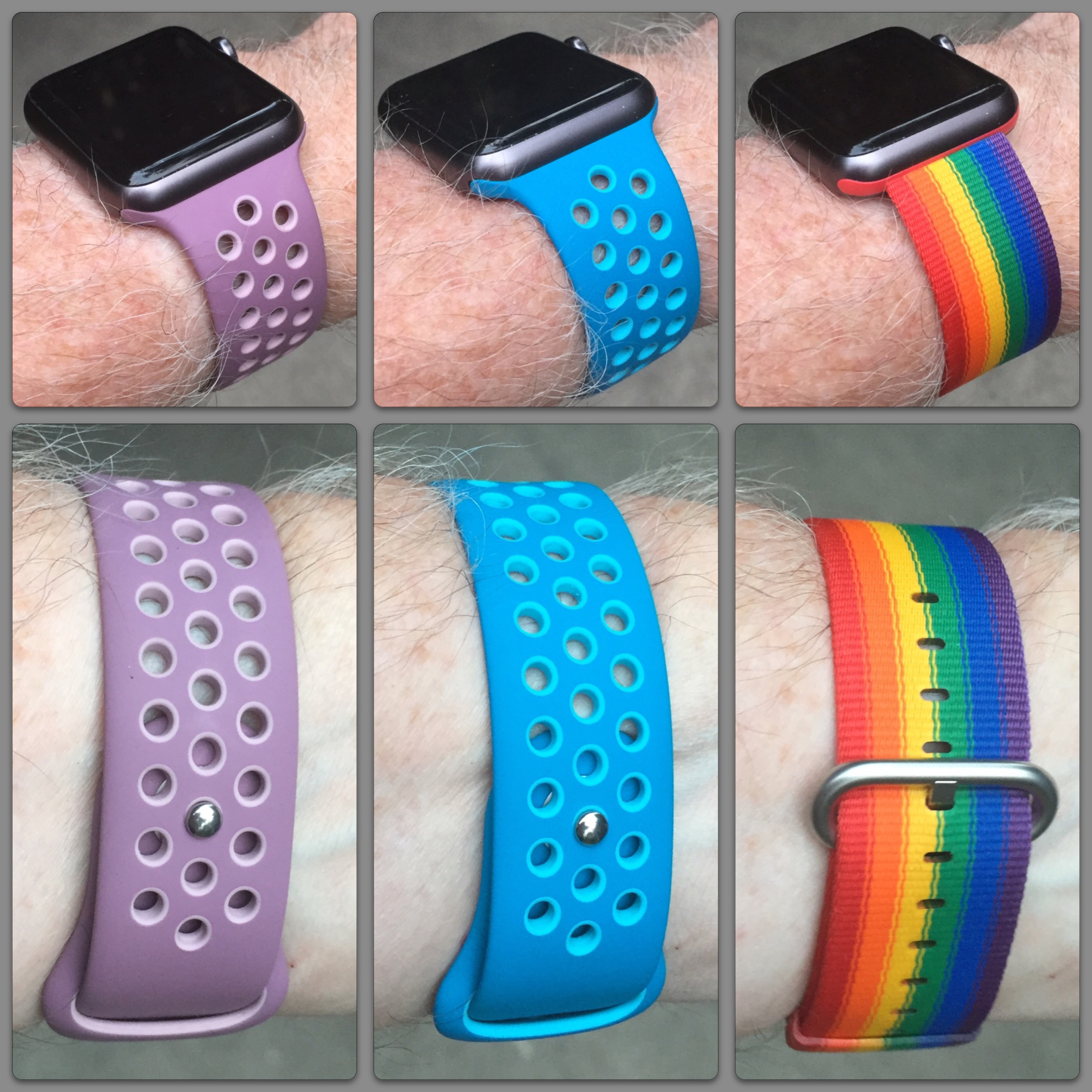My contribution to the stream of pics - series 0 Space Gray Sport, outside, shortly before sunset, but quite cloudy. In real life, the blue feels just a touch darker and more saturated than this, but all in all, pretty close to how they actually look to me. From three feet away in daylight, the violet is subtle, the blue is more bold (and the rainbow is fabulous!).