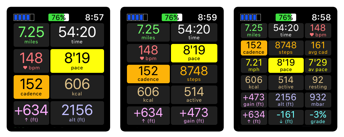 Holy crap I like that bottom right presentation! Because there are so many fields it would be nice if you can eventually add the ability to highlight with a color or red outline certain fields. Apple workout app lets you scroll to highlight one field. I currently do this for pace if trying to improve or HR if running to HR. I can see cadence highlighted for me too since I am working to improve mine. Awesome work Ian! Ready to beta test on the Watch when you are. I like to run with just my AW3 LTE, Scosche and Plantronics ear buds. Which reminds me. If you can add feature to automatically start a playlist like Apple workouts does that would be great!