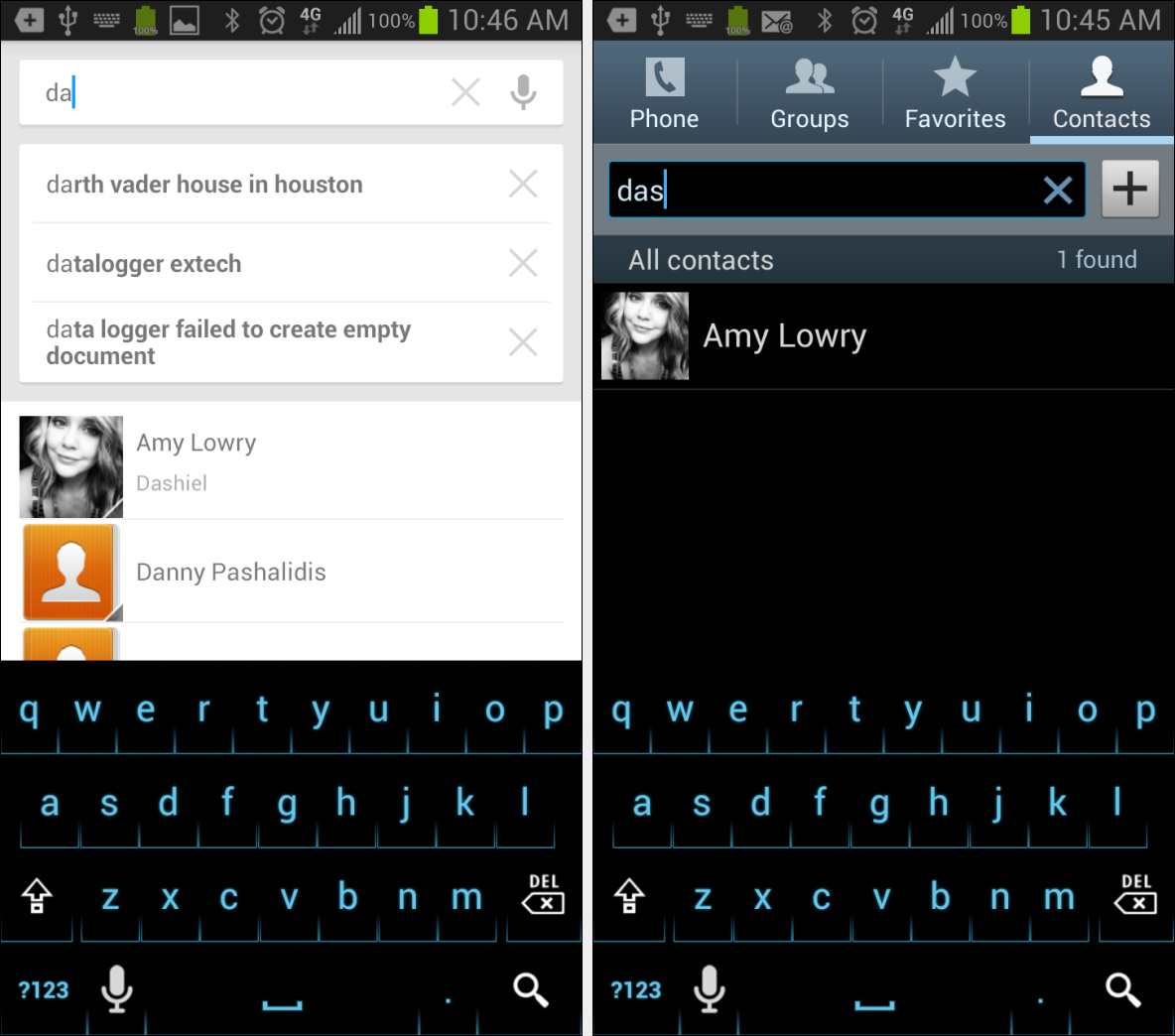 That is strange. To test this I added Dashiell to someone's Organization field and both the phone app and Google Now found her when I begun typing Dashiell.