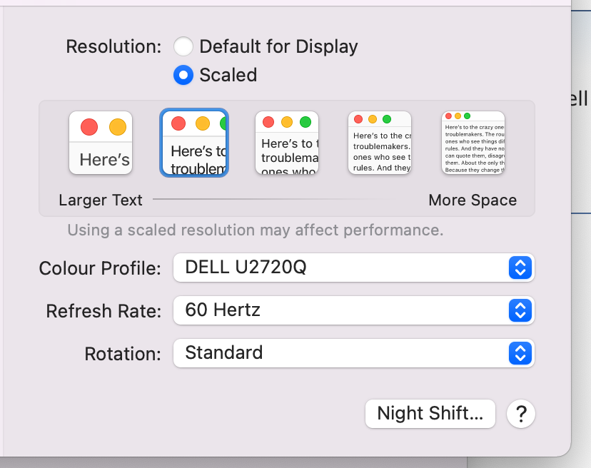 Connected to a Dell U2720Q 4k display via USB Type-C.