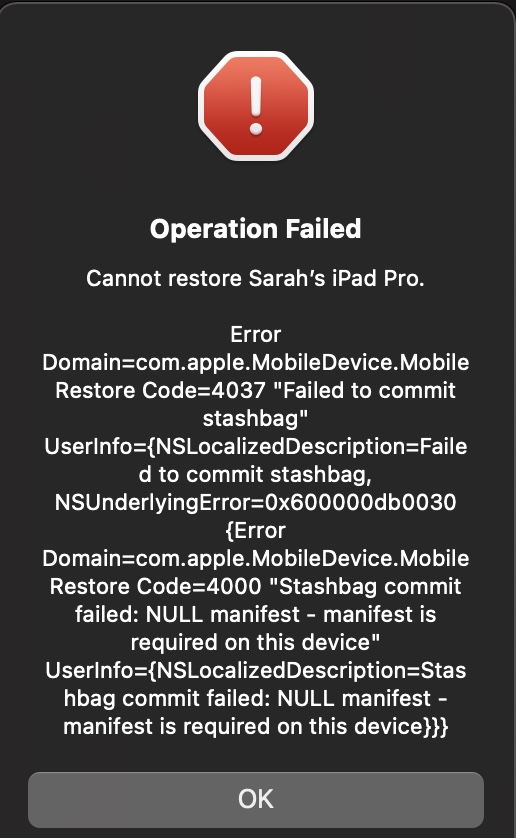 The Finder error is Fig. 1 (which is incredibly helpful, I'm sure you'll agree). The iMazing error is Fig. 2. There's a bit more info on the iMazing error, but I don't know if any of it's pertinent, or peculiar to iMazing.
