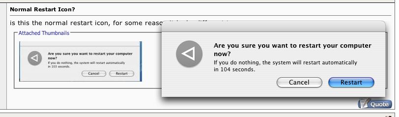 AmigoMac macrumors 68020 Aug 5, 2003 2,063 0 l'Allemagne Oct 13, 2004 #4 derekamoss said: is this the normal restart icon, for some reason it looks different to me. Click to expand... yours looks fugly Attachments restart.jpg 35.2 KB · Views: 80