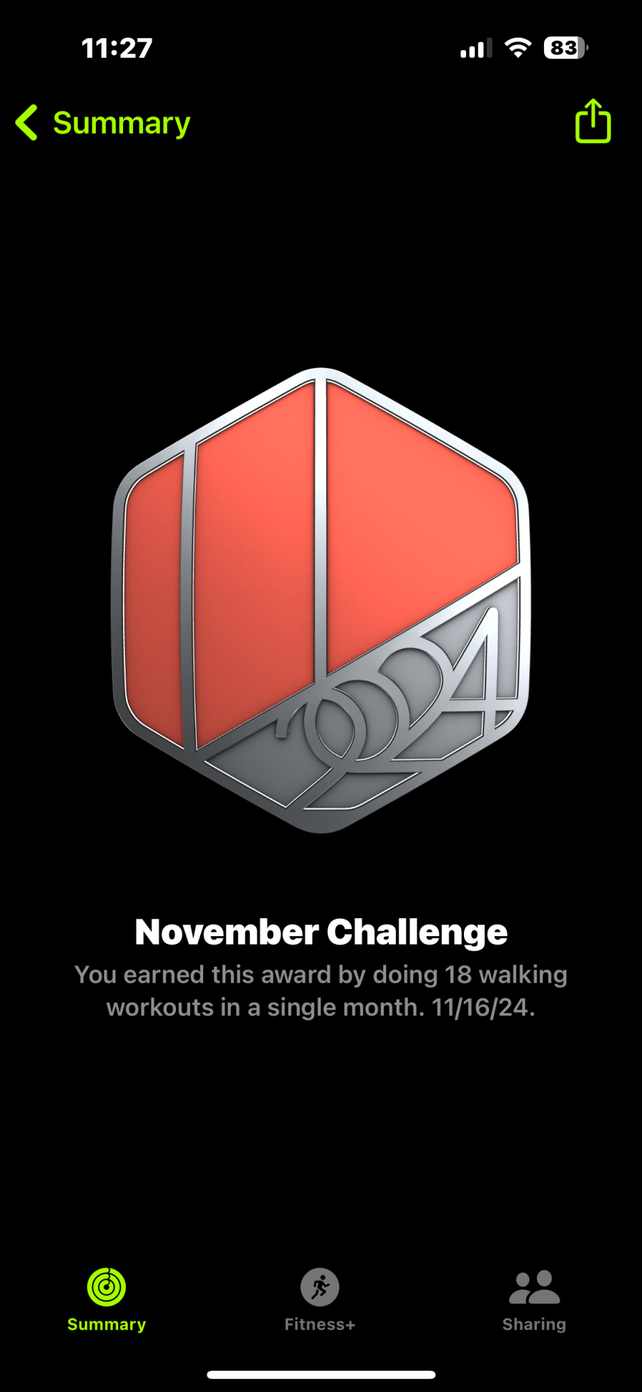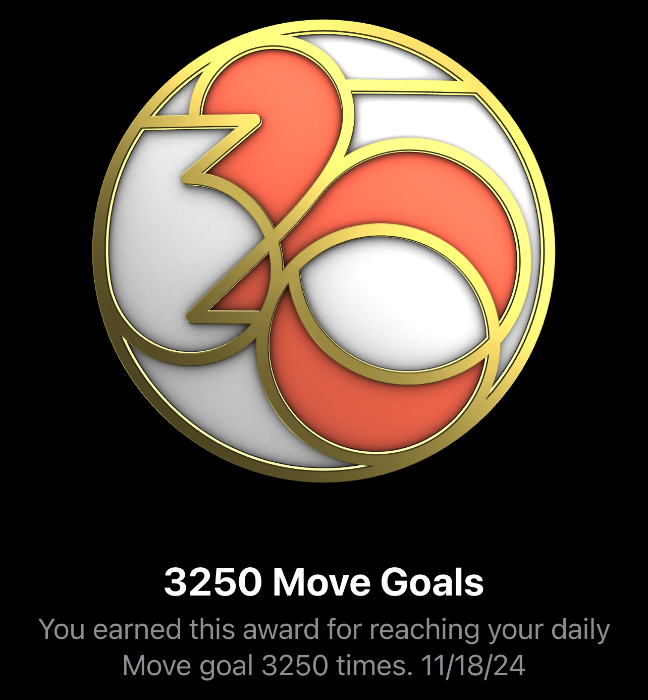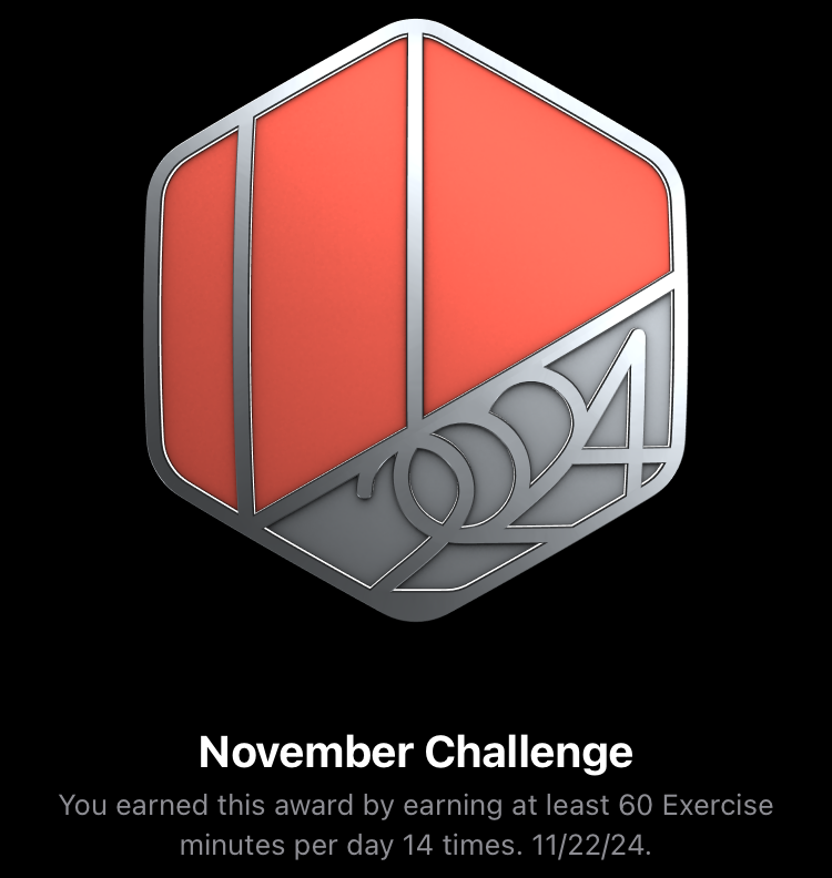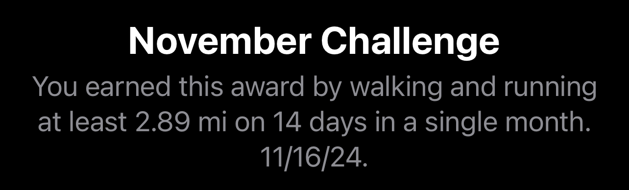 This was almost the same as my goal except it was 2.85 mi. I hate that they keep making it harder to achieve but then again I did hit the goal on Saturday so all is good.Done with November, looking forward to 14 times x kcal or minutes in December - not