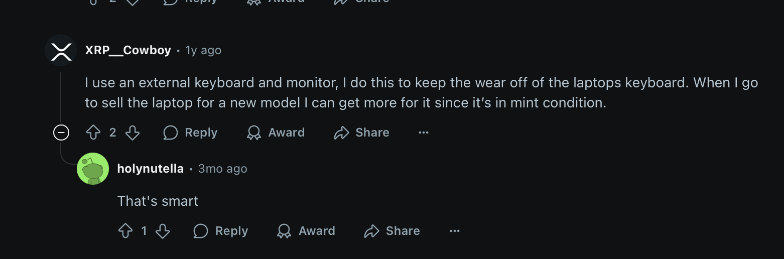 It makes a grand total of zero sense. The increased resell value is less than the value of the external keyboard and monitor. I use those because it's much better than using the laptop's, but just for resell value...