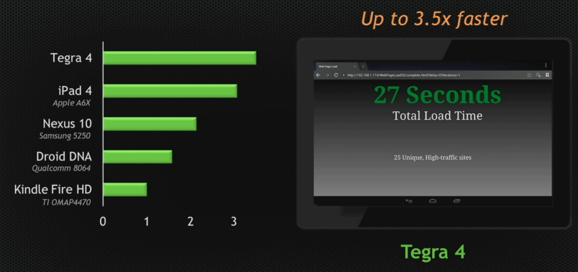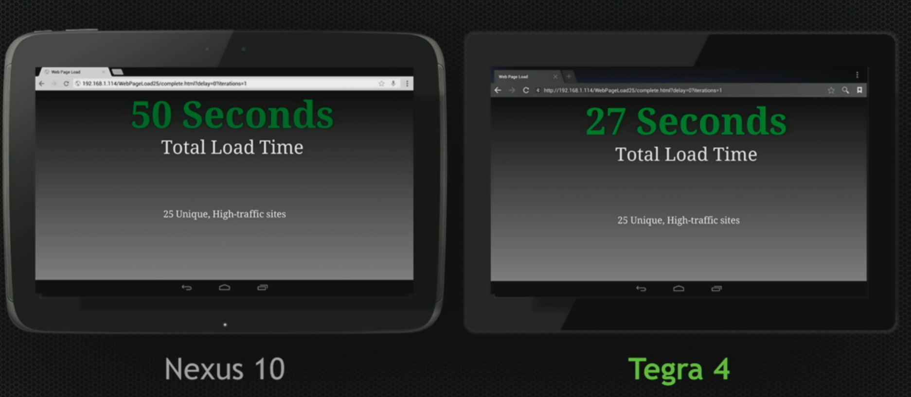 -Tablet with Tegra 4 went through 25 web pages in 27 seconds, compared to Nexus 10 which did it in 50 seconds.