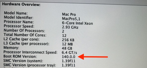 I am still trying to set up a High Sierra boot drive (trying to locate a working installer) but I was able to boot into Snow Leopard and the BootROM firmware is still at v140.00 (see attached).