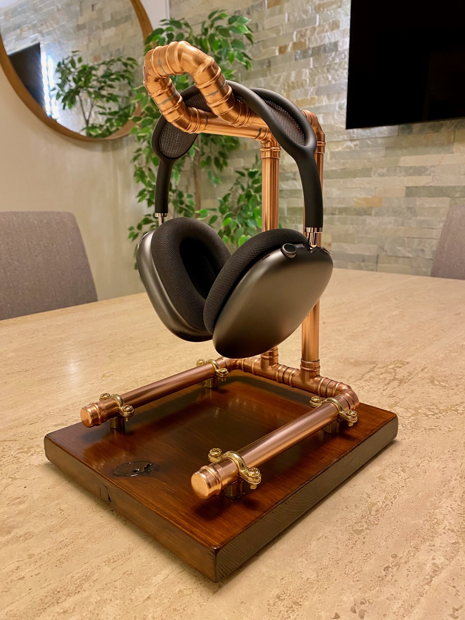 dude where did you get that stand from? Amazing. You use the airpod's with the systems at all? I did at one point, but ended up just using the steelseries arctis 7x for both. Too convenient.Something a little different from me. Bespoke stand with polished and lacquered copper body, secured onto a stained wooden base with felt lined underside.