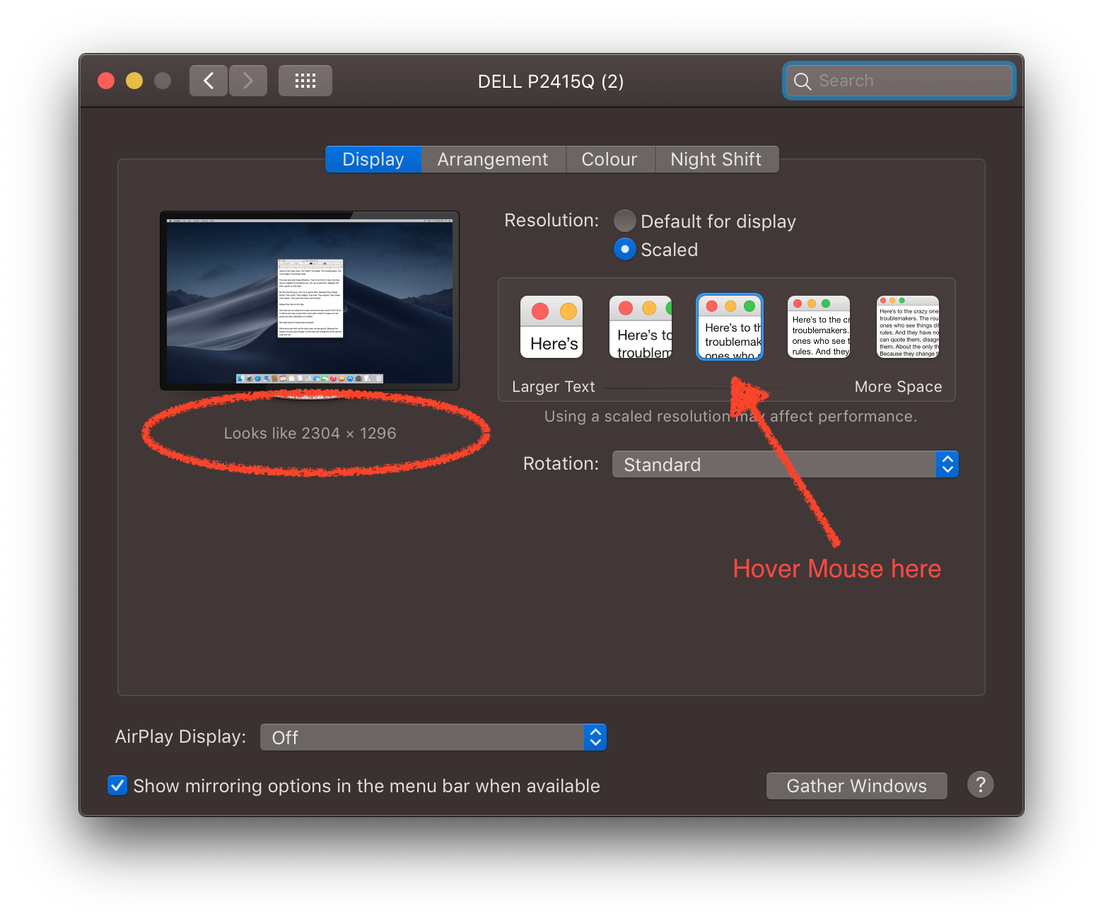 Ok, well the first thing to test, would be trying your iMac's built-in 4K display at a "scaled" resolution. The "2304x1296" I mentioned earlier is 120% of the "native" retina for my 4K's, so to simulate the same amount of "scaling" on your iMac you'd need to set it to something like 2457x1382 - it's possible that exact figure isn't a provided option but there should be something close. Look in System Preferences > Displays > click "Scaled" and see what each entry says under the little simulated display (on the left) when you over over it. I've attached a screenshot to demonstrate where it shows this info.