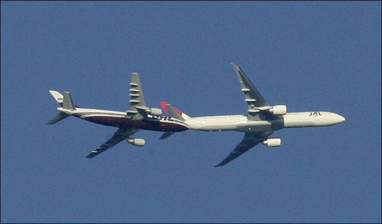 The DHL plane appears to be smaller, so its hard to believe its so much closer as that should make it appear larger than the other one.