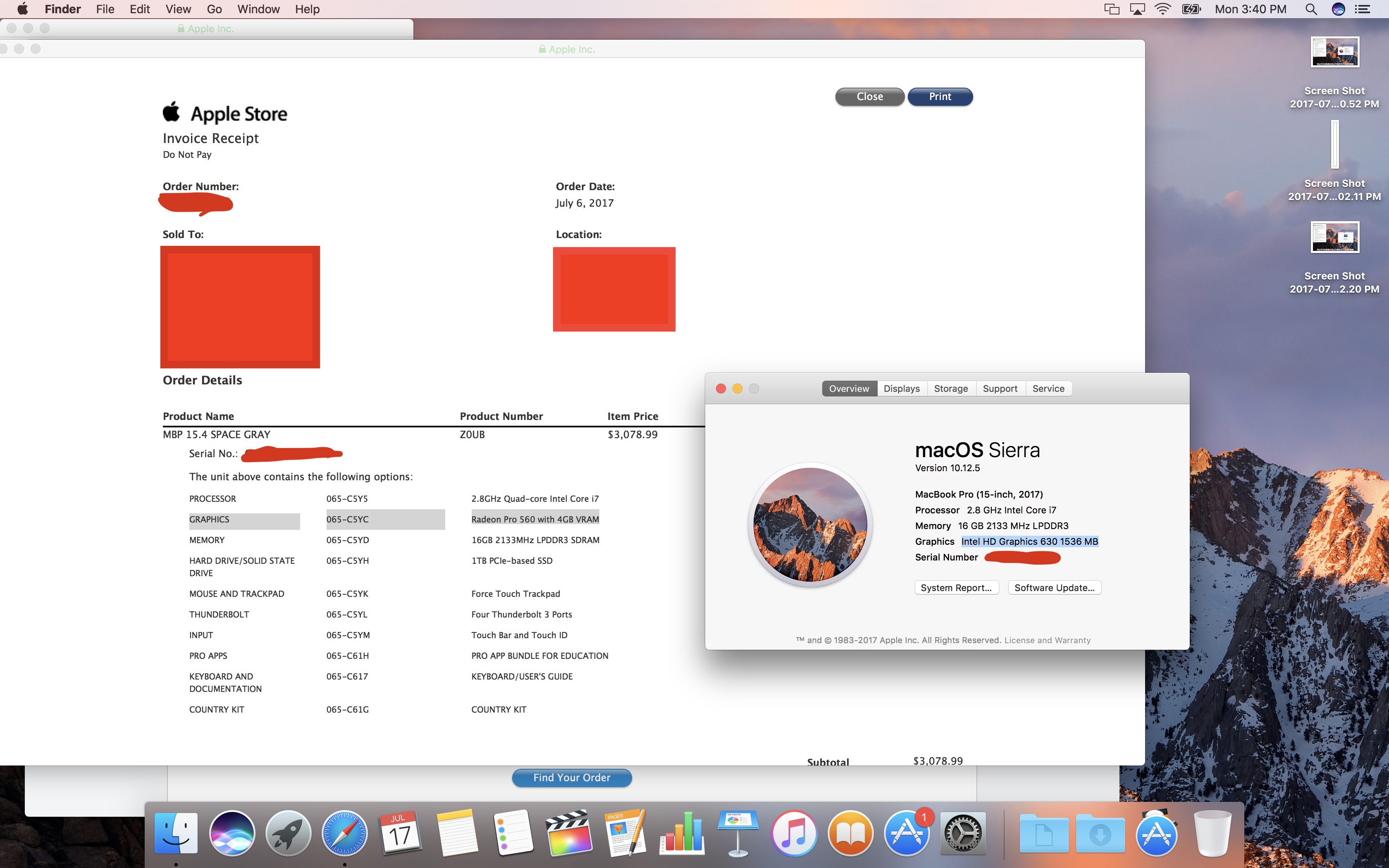 I recently purchased the newly released 15" 2017 MacBook Pro - with Radeon Pro 560 4gb graphics card. I spent over $3.3k on this setup. Minutes after receiving the MBP, opening and going through the setup process I went to check out "About this Mac" and assumed I would see all the correct hardware and paid for... I was shocked when under graphics it showed Intel HD Graphics 630 1536 MB - Instead of top of line 4GB Radeon that was on my order form(reference screenshot below). This card is not currently offered on any of the 2017 updates, not even the 13" they have Intel 640. How is a mistake like this possible? I spent and incredible amount of money on this laptop and I wonder how many others are out there running cheaper hardware then they paid for. Currently on hold with Apple for over an hour why they scramble to figure this out.