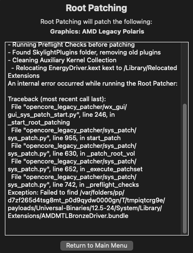 Same obstacle did I encounter yesterday by in MacOS Sonoma 14.5.1 succesfully install. the OCLP 1.6 (Beta) and it did its Post-install Root Patch - showing it had to update my graphic and Modern Wifi - then past install of public MacOS Soquoia 15 and being pinged it had to conduct Post-install Root patch - here is my message txt.View attachment 2407431