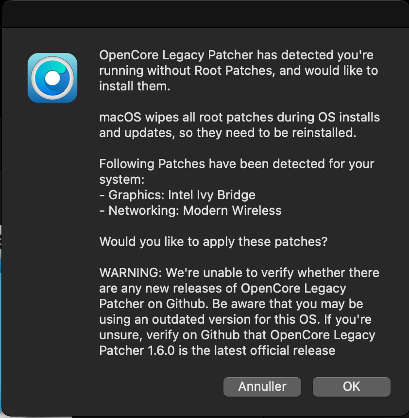 my Post-install root patch also failed to installThat popup, which detects that OCLP patches have not been installed yet, can be cancelled, as you are getting ready to do an install of those patches. Or, you can decide to install the patches by clicking the "OK" on that popup. The results,either way, should clear up the patching issue.