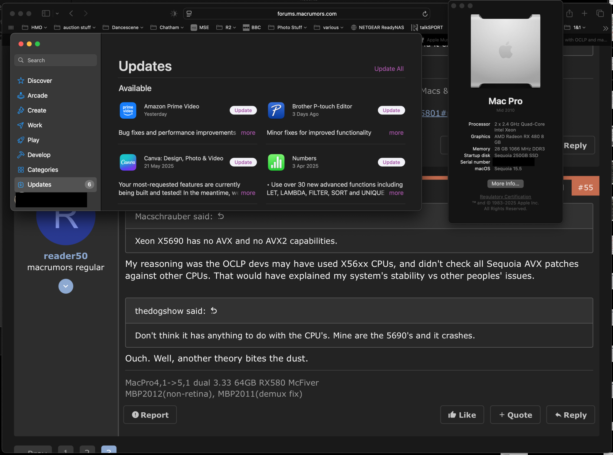Don't think it has anything to do with the CPU's. Mine are the 5690's and it crashes.I'm not sure why my Sequoia installs do not have these problems. Just upgraded to 15.4.1 - app store and Safari still good. But it suddenly occurred to me - my CPUs are upgraded to X5680s. Perhaps X56xx CPUs are the difference between stability and weirdness.