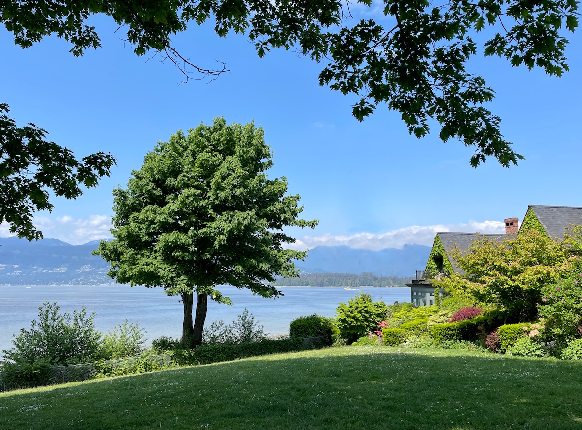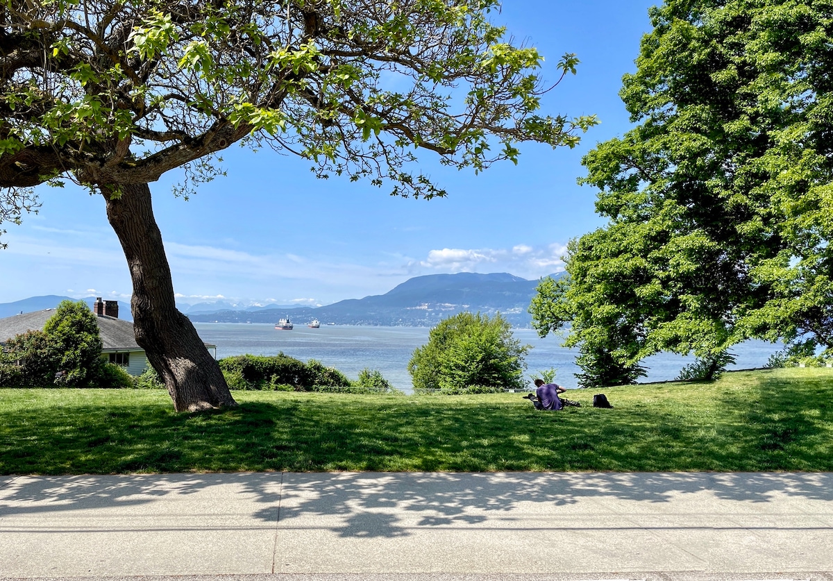 This is a different one *not a panorama, the boats are more visibile but I don't know if there is too much of the sidewalk . It has some horizontal symmetry with the lines of sidewalk, field and ocean