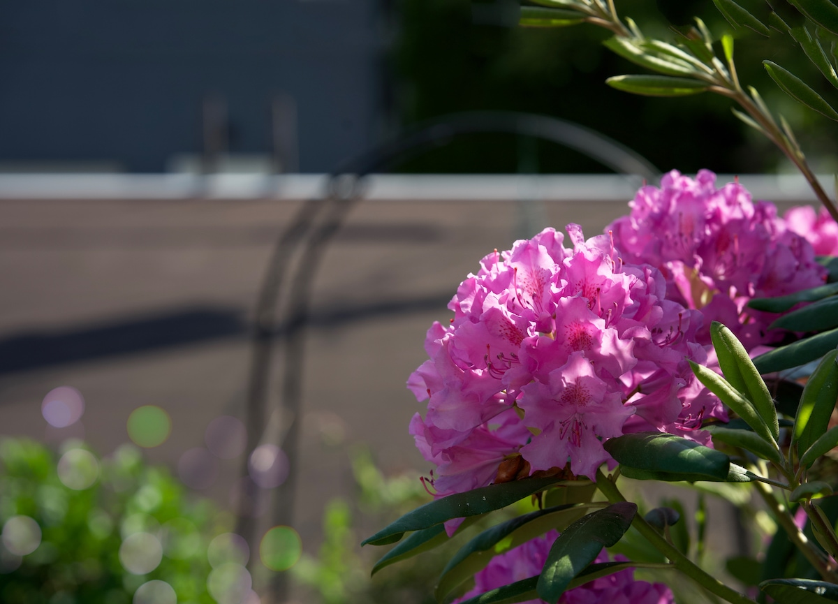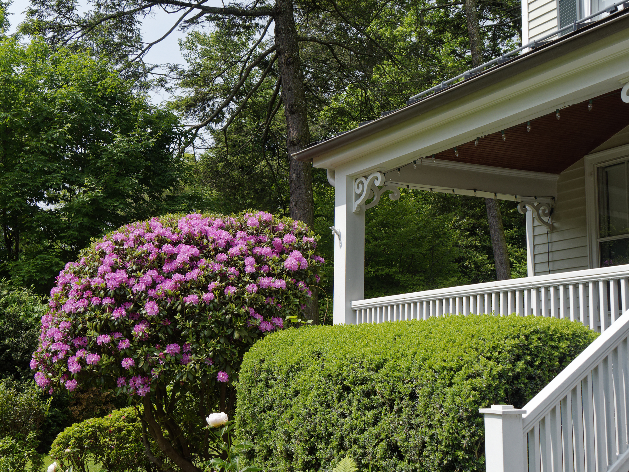 It is!!! Originally I'd intended to concentrate on the jigsaw work on the porch but got distracted by the flowers . The house (it's attached to the Presby Iris Garden )is from the mid 1800's IIRC . Wonder how old the rhodi is?Such a pretty rhodi!
