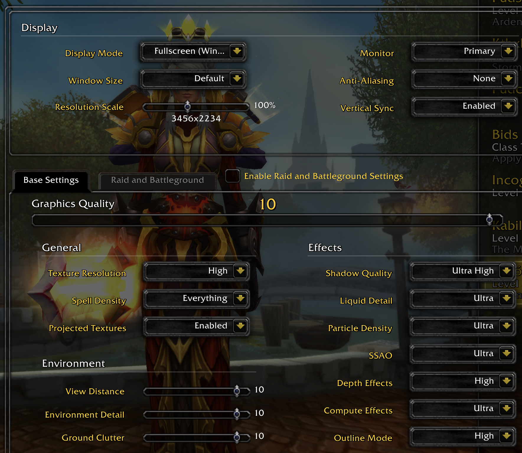 So I was rather impressed here. I set WoW to 10/MAX settings. I removed the Max Foreground FPS limitation. I set Target FPS to 120 FPS. Max distance, shadow, and other settings all maxed out. I tested this on my alt.