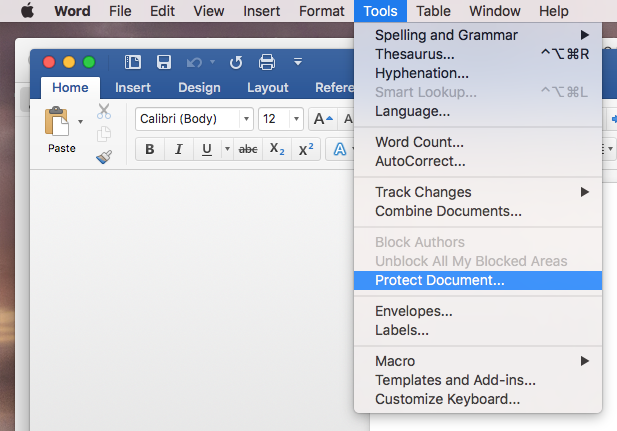 Is it a Word document (*.docx) that you're trying to protect? If it is, and that option doesn't show up, then you probably need to reinstall Office 2016 as the previous reply advised. Since Office 2016 is only available as a download from Microsoft, you might want to download it again using the 2016 Office key you purchased from the Apple Store. Reinstalling Office will not overwrite or remove your documents or templates.
