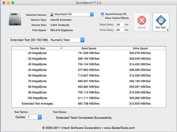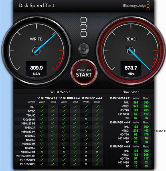 I then ran multiple tests, including BlackMagic, QuickBench and importing a large FCP X video project. As you can see from the attached graphs the read performance was over 550 MB/sec with the FD at 67% full on BlackMagic and QuickBench.
