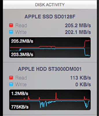 On the FCP X import, the hit ratio on the SSD was almost 100% and the combined read/write rate was over 400 MB/sec. See attached iStat Menu graph which breaks out SSD vs HDD portion of Fusion Drive. It would have been even higher but at that point the process was CPU bound.