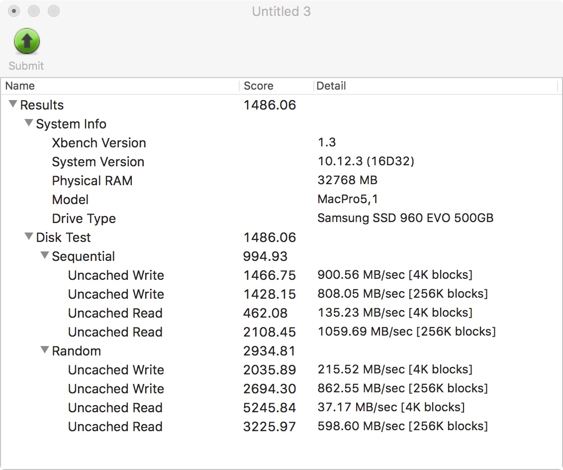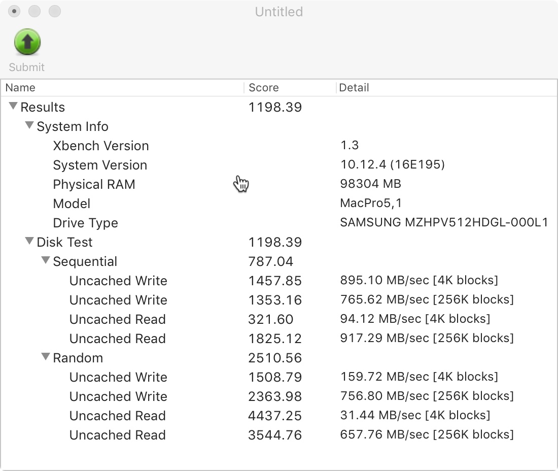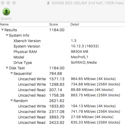 Attached are two benchmarks from my 5,1cMP (very similar to Jed's setup, but with an Amfeltec Squid in Slot 2 carrying an Apple/Samsung 1TB SSUBX with 100% free space). My SSUBX AHCI stick seems to be a lot slower on Xbench than either of your drives (despite BlackMagic results of 1420/1492 MB/s). I don't have an explanation for this but nothing seems wrong (x4 link width and 5.0GT/s link speed). I also ran Xbench on a 32GB RAM disk; the MBP 13.2 results above were stunningly close to cMP RAM disk overall and the MBP SSD was faster at small uncached reads. That is truly impressive MBP performance.