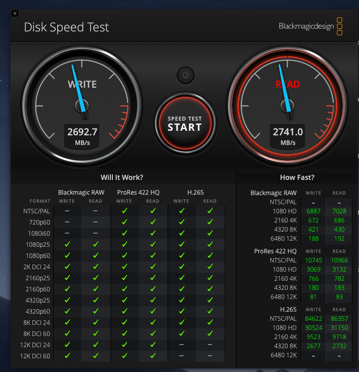 Here's Blackmagic. These are about the speeds I was expecting. Fully 2x faster than the SSD on the Sonnet card.