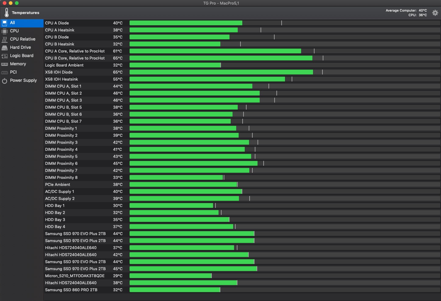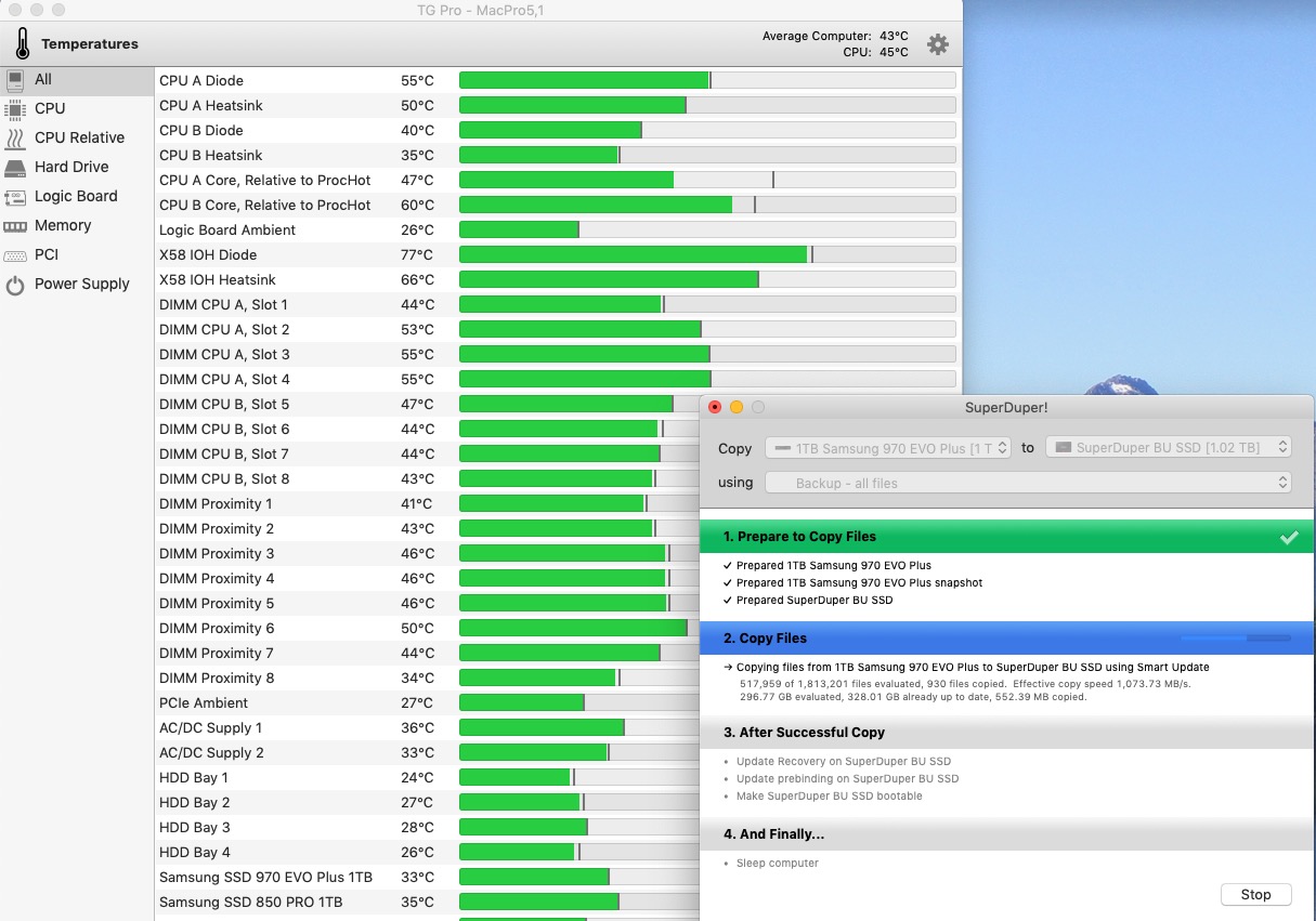 Here's our MacPro5,1 temperatures doing a 1,050 Mbps SuperDuper! Smart Copy (clone) from our 1TB Samsung 970 Evo Plus on an Aquacomputer KryoM.2 Evo PCIe card in slot 2 to a 1TB Samsung 850 Pro SSD on an Apricom Duo PCIe card in slot 4. Temperatures all completely normal.