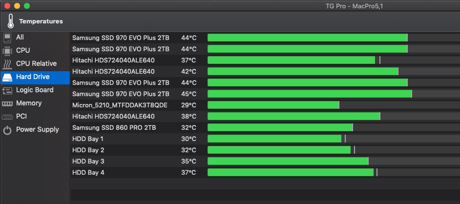 I don't see TG Pro reporting an NVMe temperature either... even with the latest update to TG Pro. These temperatures were during a SuperDuper Smart Update 750Mbps transfer from our 1TB Samsung 970 Evo Plus in it's Aquacomputer KryoM.2 Evo PCIe card in slot 2 to a 1TB Samsung 850 Pro SSD on a Apricom Duo PCIe card in slot 4.