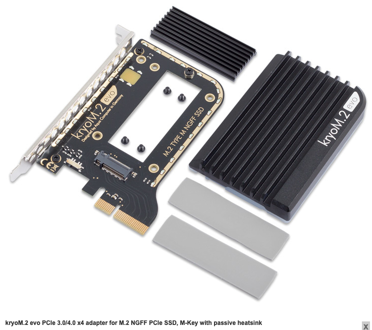 $Au380 (with cooling added). StarTech.com Dual M.2 PCIe SSD Adapter Card - x8 / x16 Dual NVMe or AHCI M.2 SSD to PCI Express 3.0 - M.2 NGFF PCIe (M-Key) Compatible - Supports 2242, 2260, 2280 - RAID & JBOD - Mac & PC (PEX8M2E2) I'd have to add some cooling kits for the two NVME cards which would cost $100 to $130 for me.