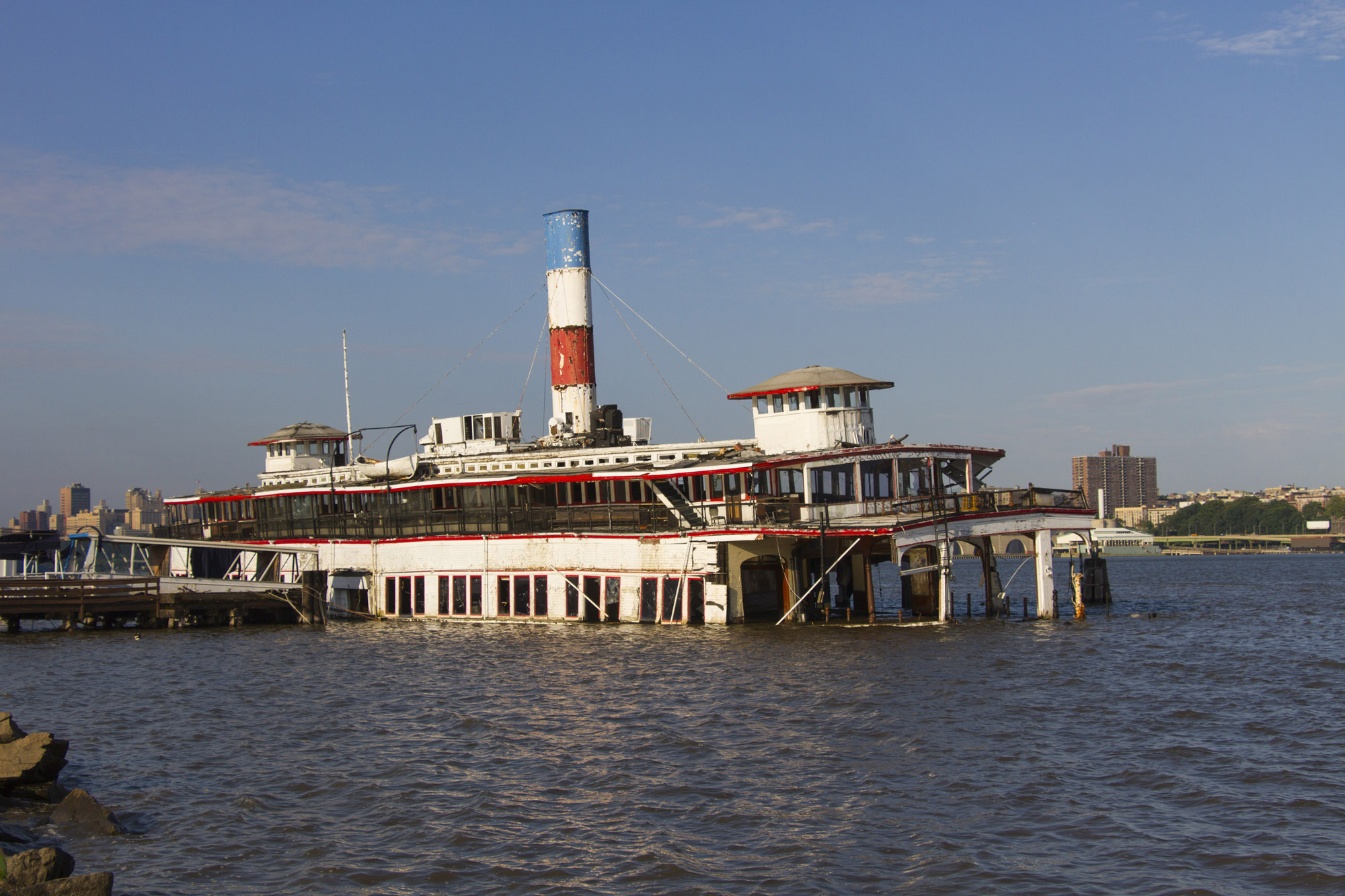 It's the late Binghampton , ex Hudson River Ferry / floating nightclub / source of income for lawyers / derelict . The photo is from 2014 / In 2017 a giant floating crane appeared and...This looks the the bigger sibling to the one I posted a week or two ago.