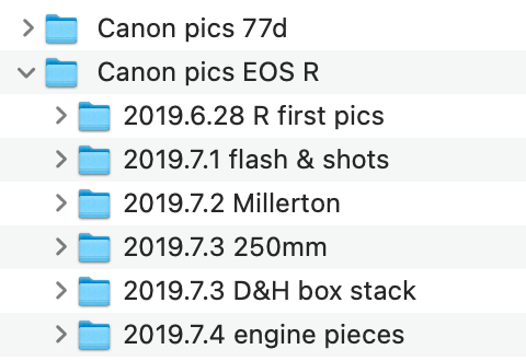 To organize your images into folders, use a date-based system that works for you, so when you open a finder window, you're presented with folders in descending order, with the most recent folders at the top. Try a folder naming convention like YYMMDD-subject. So a folder of photos that you took on June 27, 2024 at a car show would be