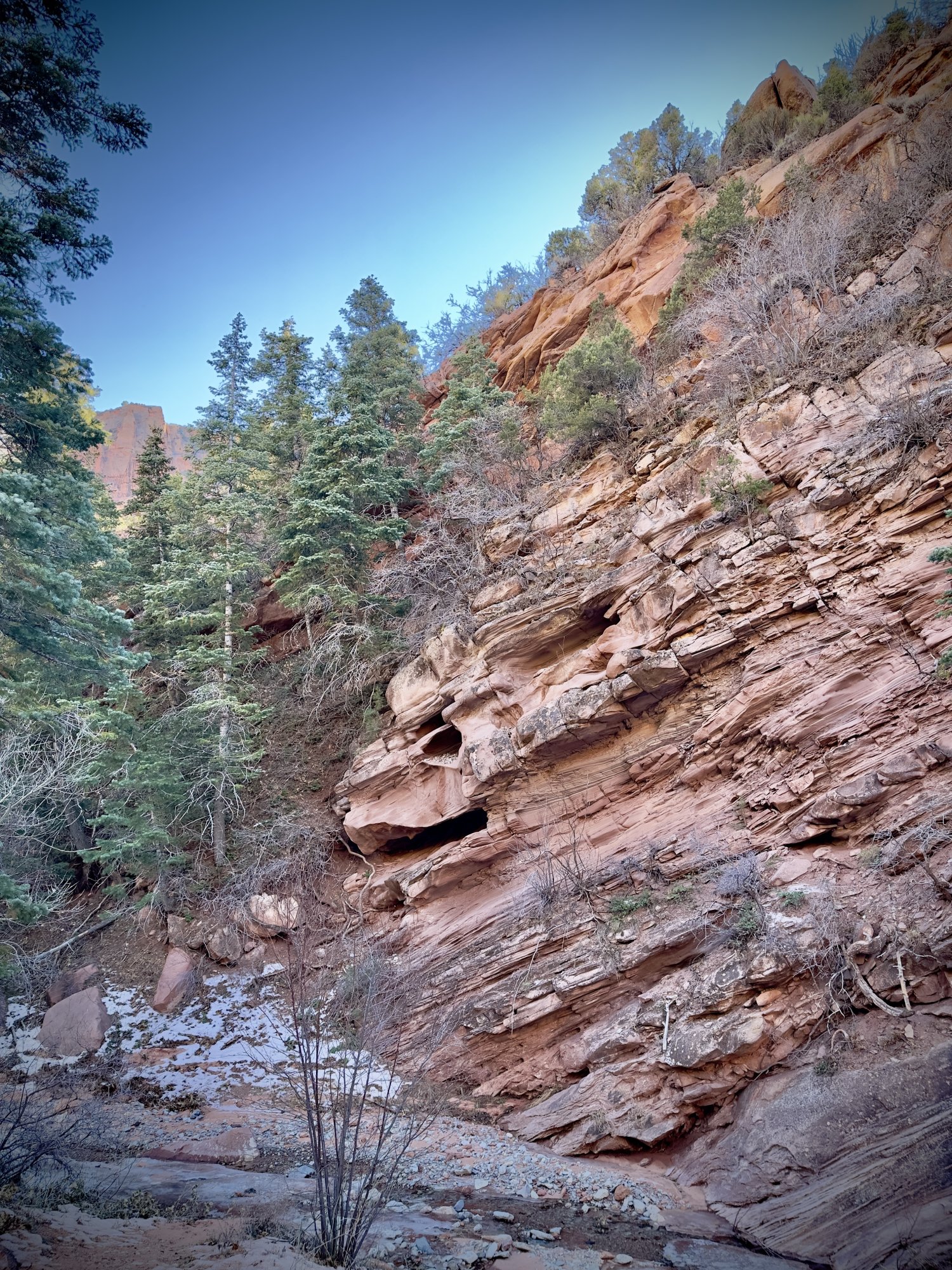 1:45 PM, New Harmony, Middle Taylor Creek, Saint George, Utah.You are a braver person than I. I have an extreme fear of heights, and an aversion to extreme cold. I got vertigo and my teeth chattered just looking at this otherwise beautiful photo.😂Taken at about the same point as yesterday's pic, this was my climbing partner.