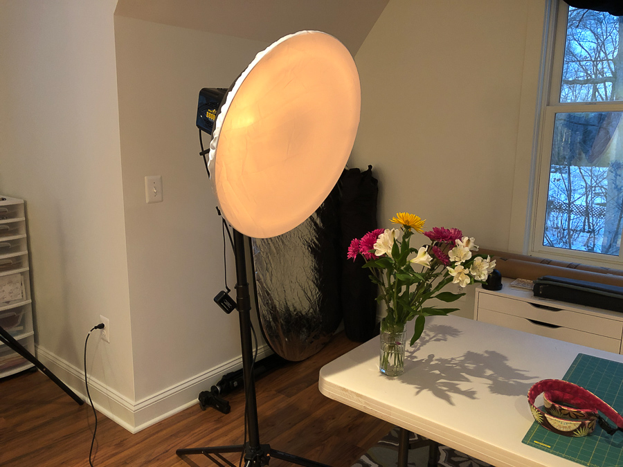 Thank you, Peter! What high praise to come from you. I actually happen to have a pullback. The angle is a bit odd here, I should have taken it more straight on, but with the tilt of the beauty dish, the bottom edge is basically inline with the table edge, and the top edge of the dish is right over the table, so the flowers are really underneath the light, very close to it.