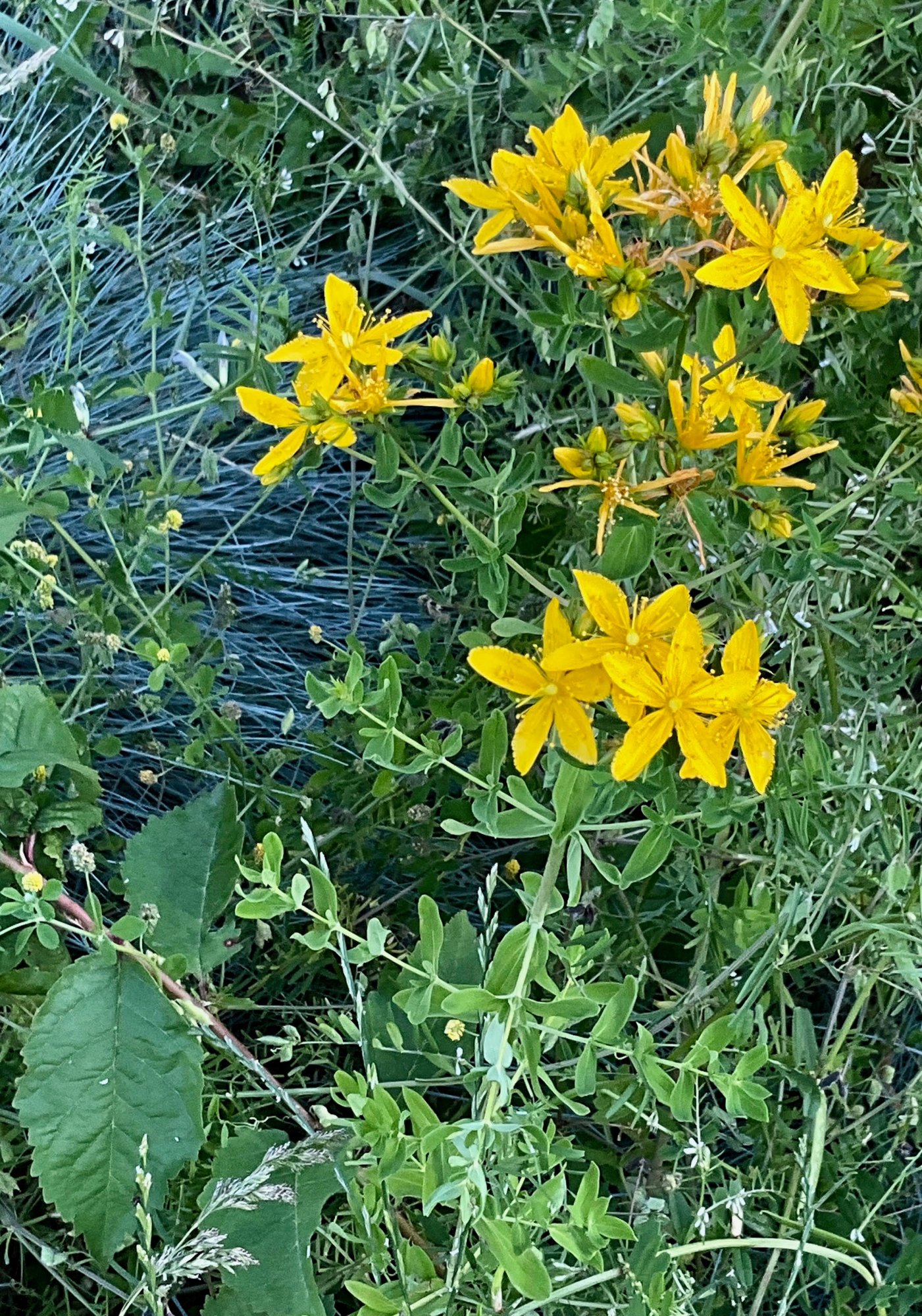 Hypericum?.. from yesterday's early-morning walkabout in the neighbourhood. The grassed area bordering a commercial plaza, produced some fun to see floral arrangements.