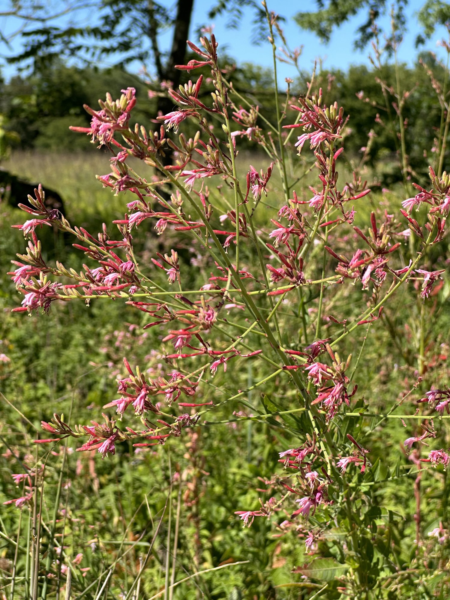 flowering plantthat can reach 6 ft (1.8 m) in height at maturity. Its upper half is made up of flowering stems, which are covered with soft, white hairs. It has light pink colored flowers, which turn a vibrant red/pink color in the late summer to early fall seasons (typically August to September). These colors make this plant attractive to butterflies and bees, and are in full bloom just before many fall plant species begin to bloom.