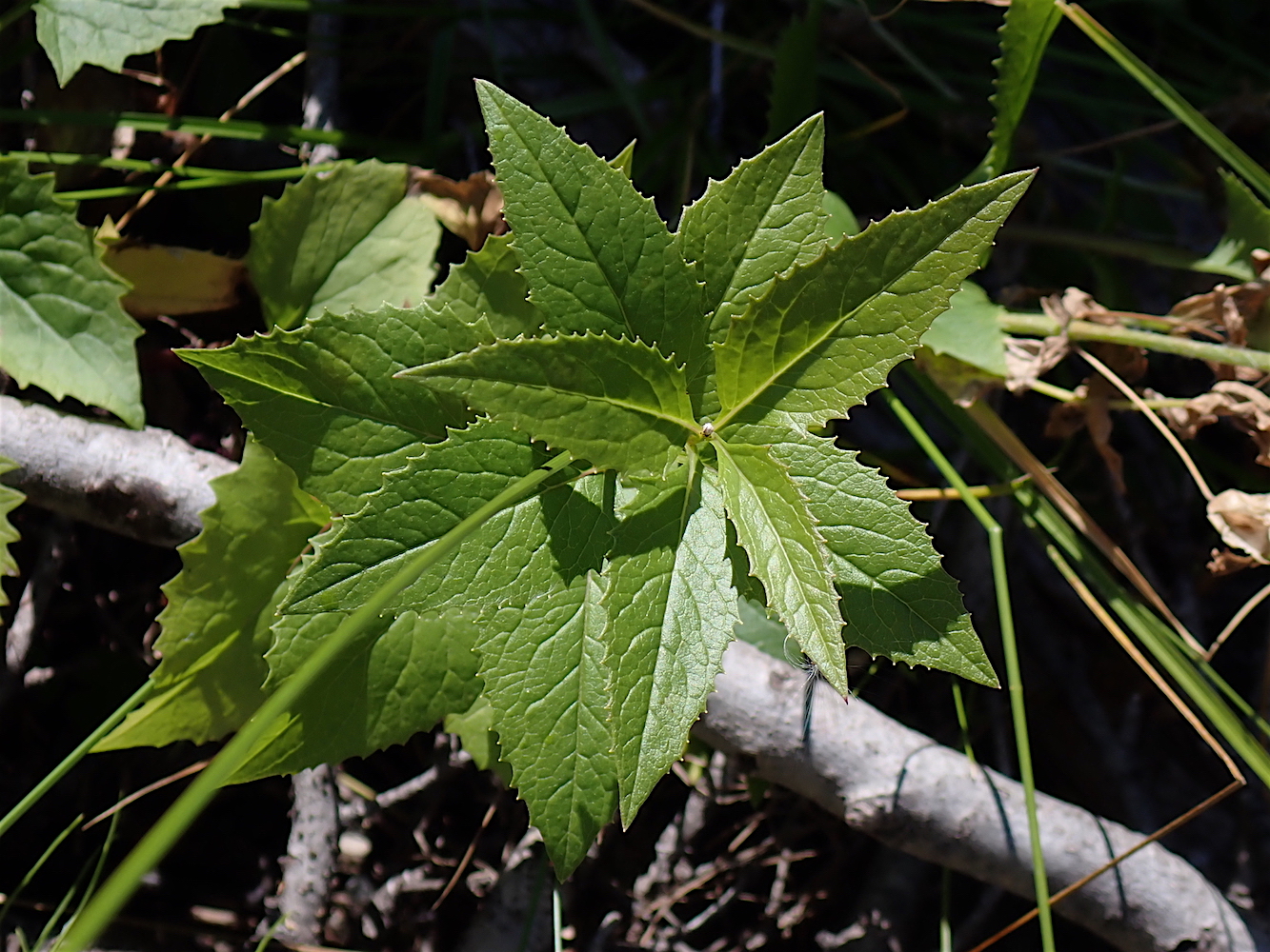 Not sure what this plant is. The angle compresses it a lot. It's about 2 feet tall with the leaves all attached to the main stem.