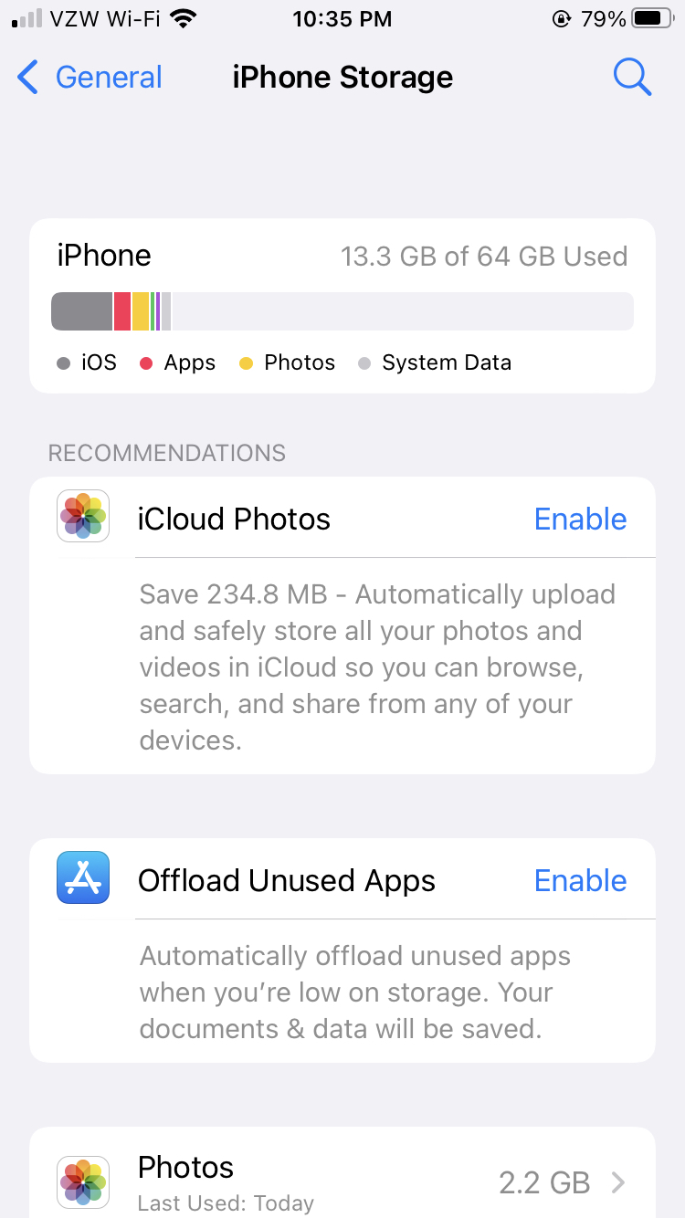 Now when I look in iPhone storage the 2.2gb of data is still sitting under Photos. If we look at iCloud Photos now we can see it doesn't have data to upload anymore it just suggests turning it on.