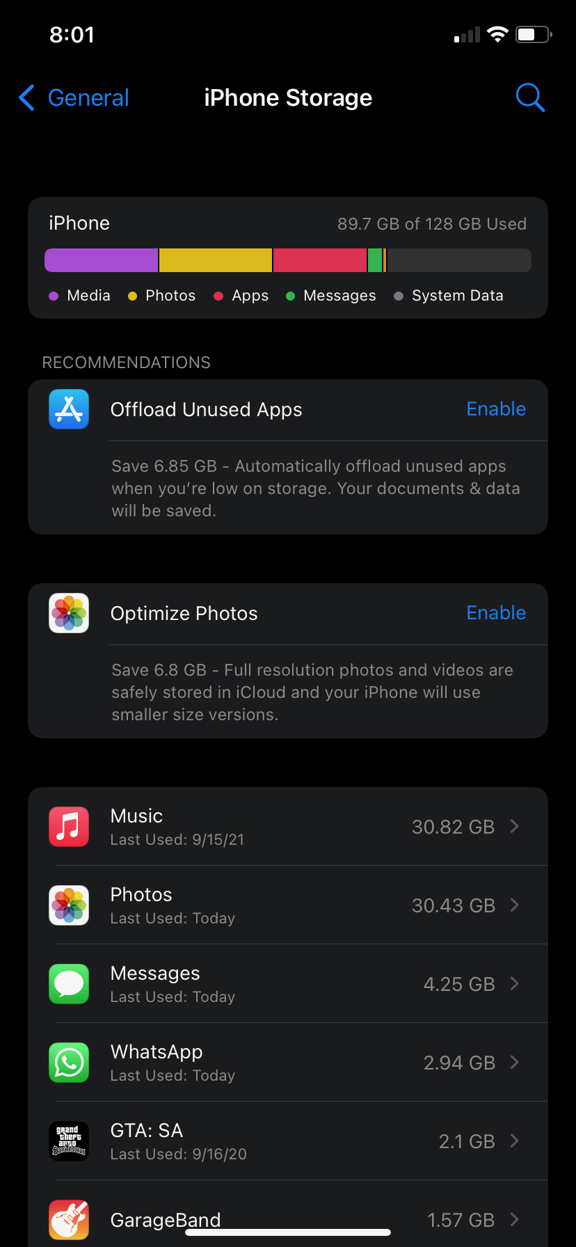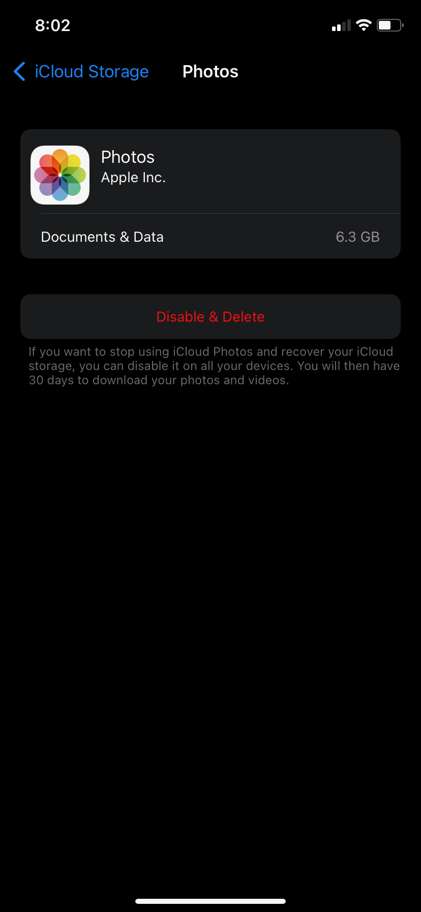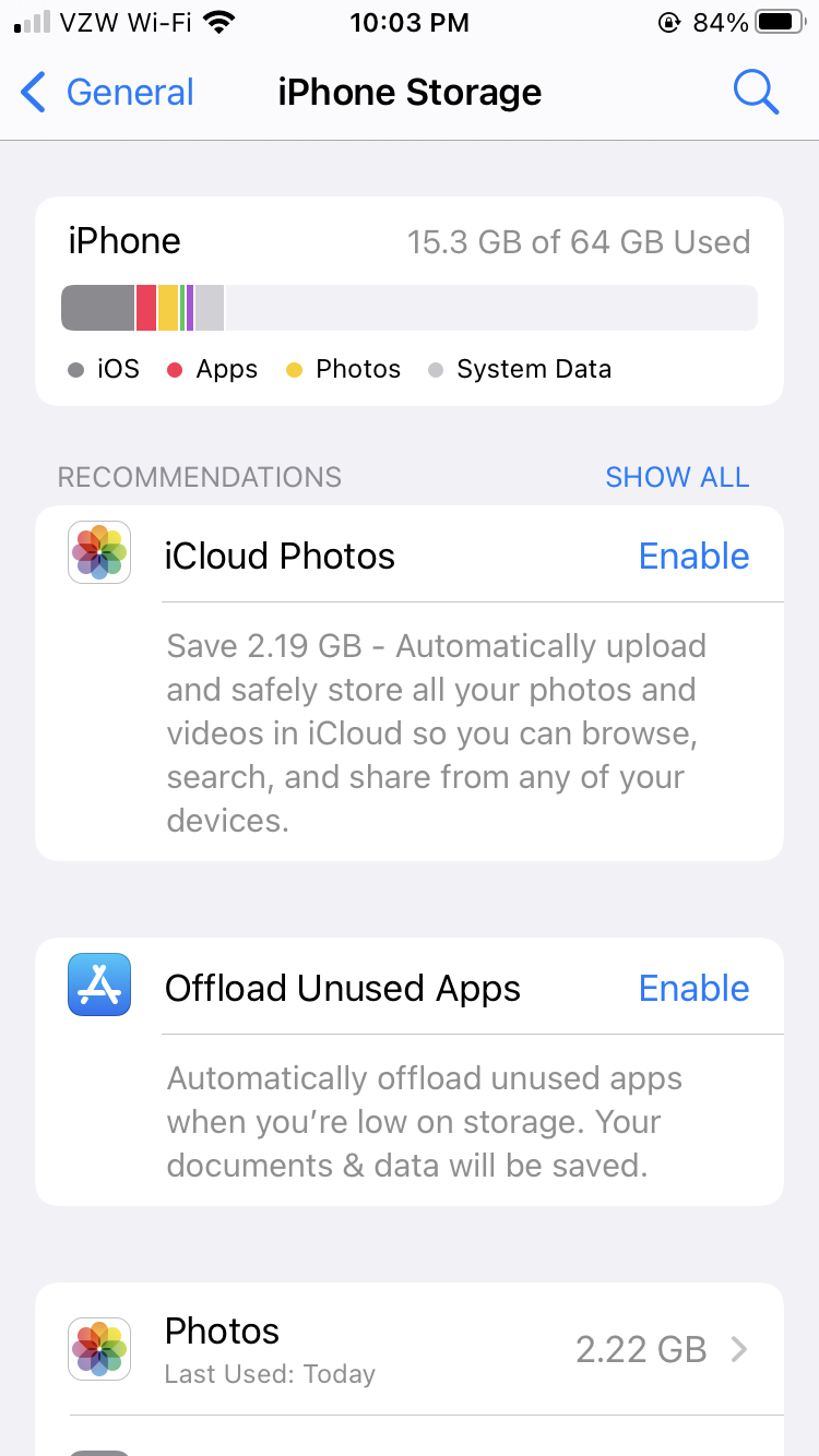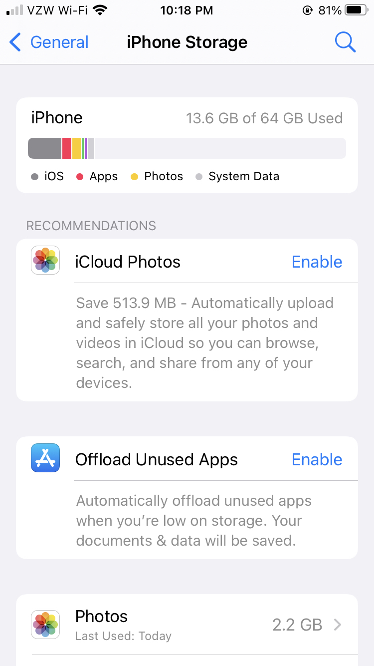 And we can see that Photo usage is still 2.2gb. However if you look at the iCloud Photo suggestion it now says 513.9mb if I enable it and upload those photos to iCloud.