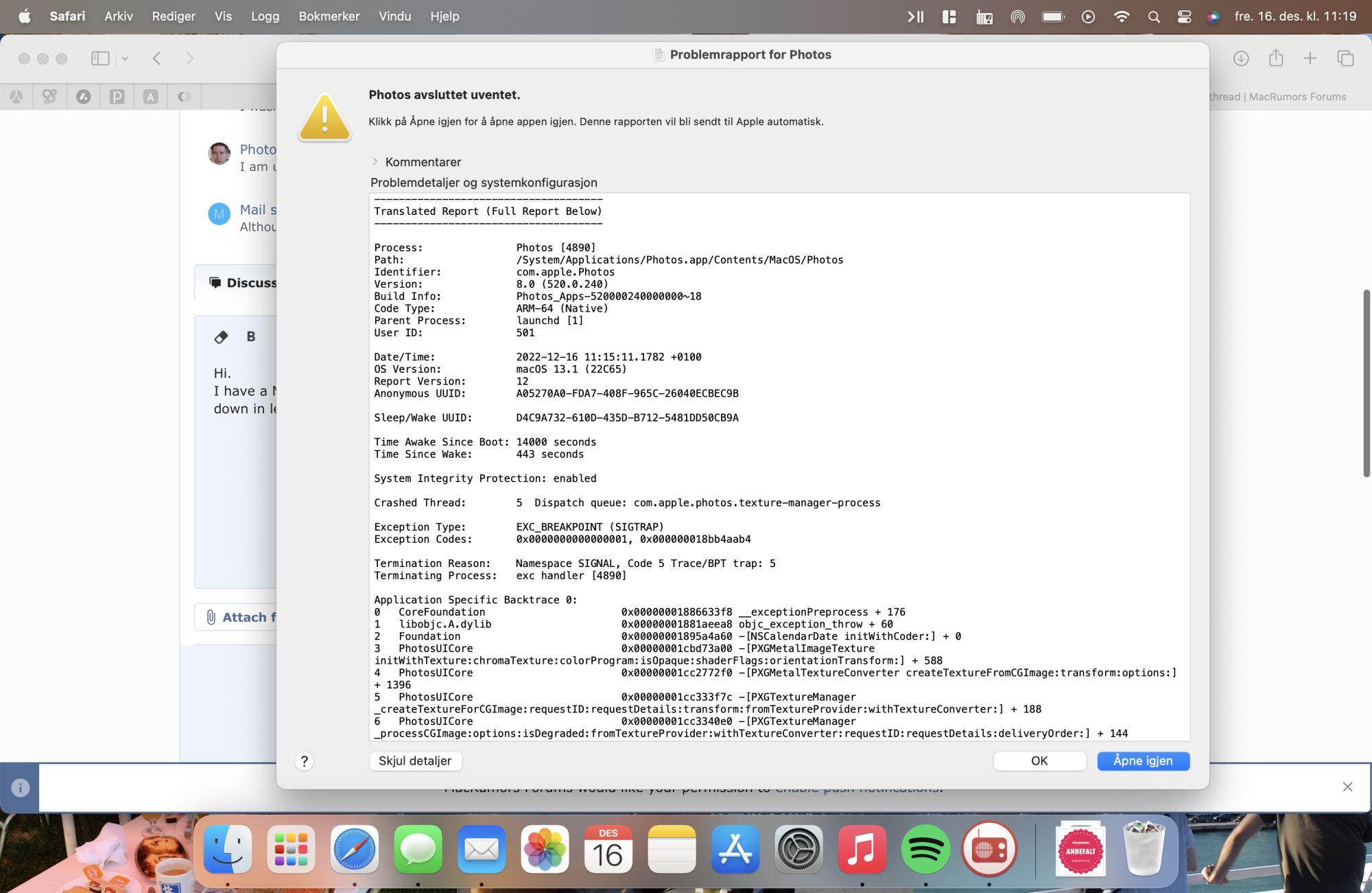 I have a MacBook Air M2, and yesterday when I sat down with my Mac to do some work, the Photos-app wouldn't open. I just opens and shuts down in less than a second, and I get a long bug report.