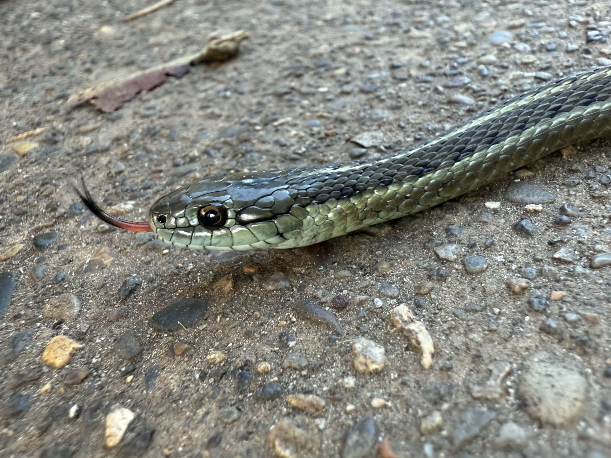 A garter snake sunning on the pavement at a local park. Photo is unedited... just a snap-and-shoot from about 6" away.