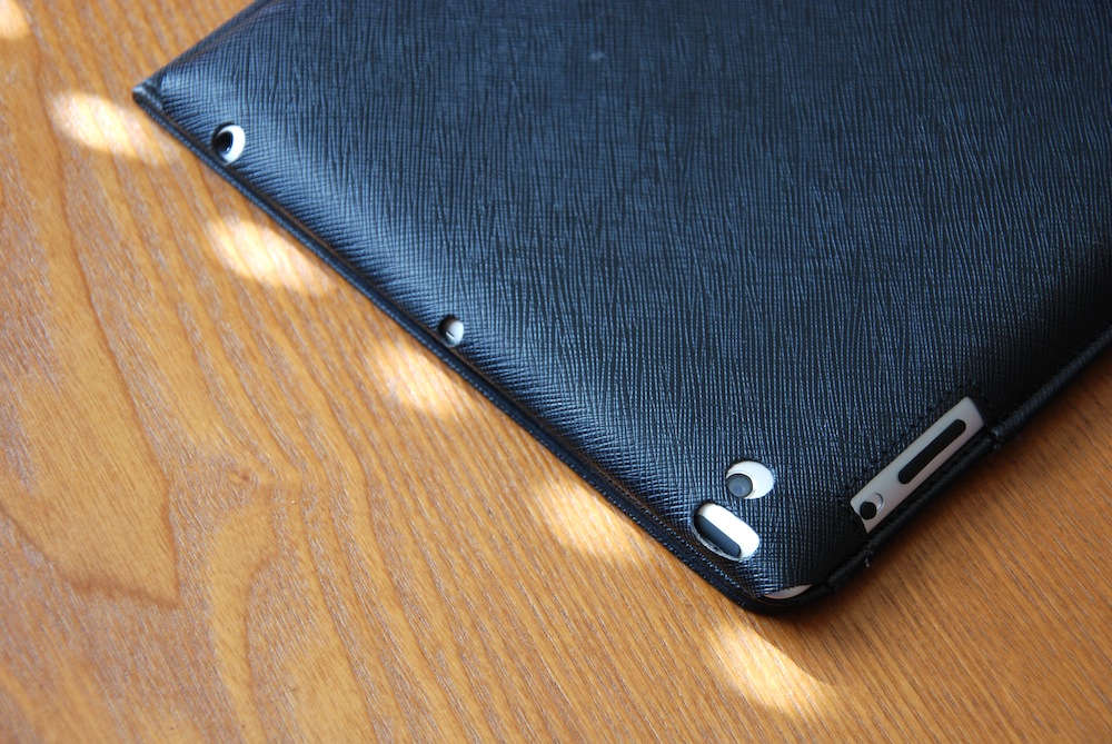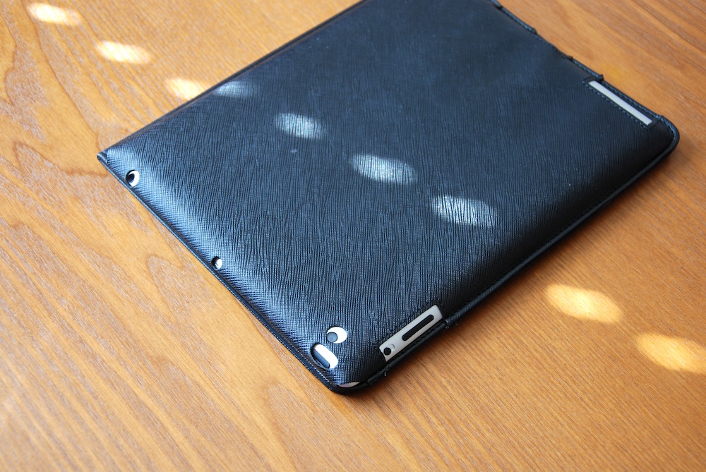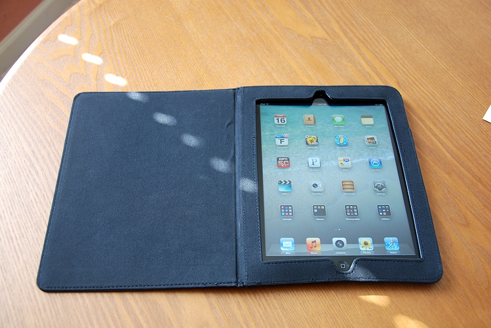 Now this is nothing special, but it fits (somewhat) and keeps a nice slim profile in a classy folio case. The new iPad fits, but slightly too snug to push all the way down, so the camera, sleep/wake, and headphone jack are a little off. I can live with that for a week or two until my Lexington case comes in.