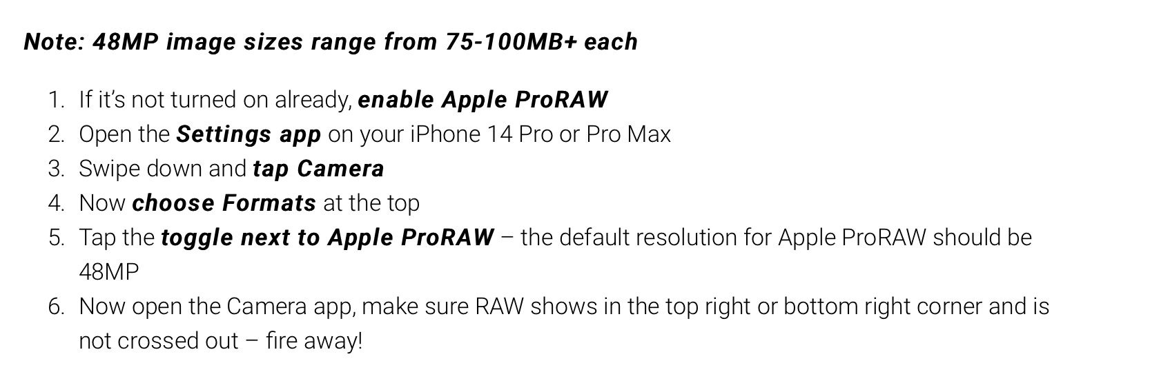 If you find or create a thread or info somewhere, please let me know.We need how to use 48 megapixels on 14 ProMax for dummies now. Since I have not had capability before learning slowly what to do with it.